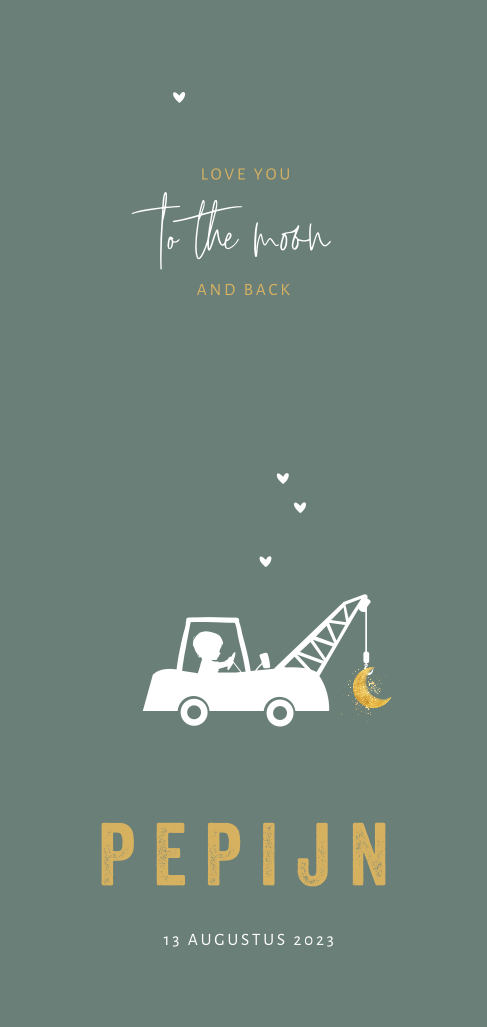 Hip geboortekaartje voor een zoon met een silhouet van een jongetje in een stoere takelwagen. Op dit kaartje Pepijn staat de tekst "Love you to the moon and back" en aan de takelwagen hangt een maan. In een mooie kleurencombinatie van groen met wit en goudkleur. Pas dit kaartje naar je eigen wensen aan in de editor.