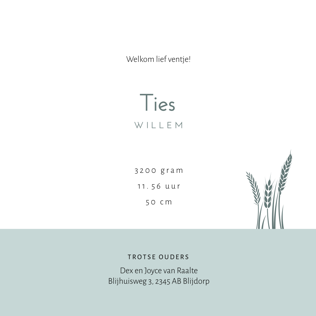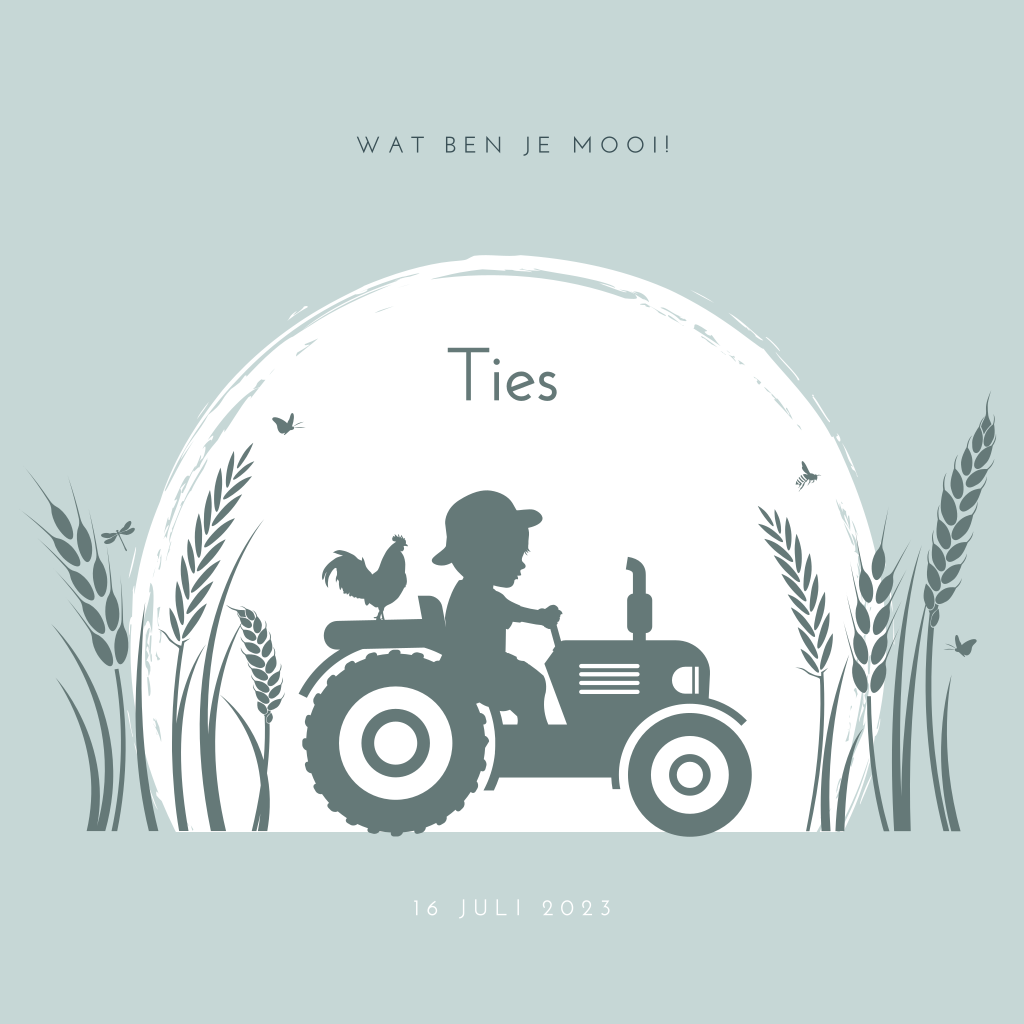 Geboortekaartje voor een zoon met het silhouet van een jongetje rijdend op een tractor door het graanveld. Achterop de tractor zit een kip en de vlinders en bijtjes vliegen over de graanakker. Pas dit zomerse kaartje Ties naar je eigen smaak aan in de editor. De teksten, kleuren en lettertypes kun je zelf aanpassen. Ook mogelijk met een ander silhouet of voor een andere gezinssamenstelling.