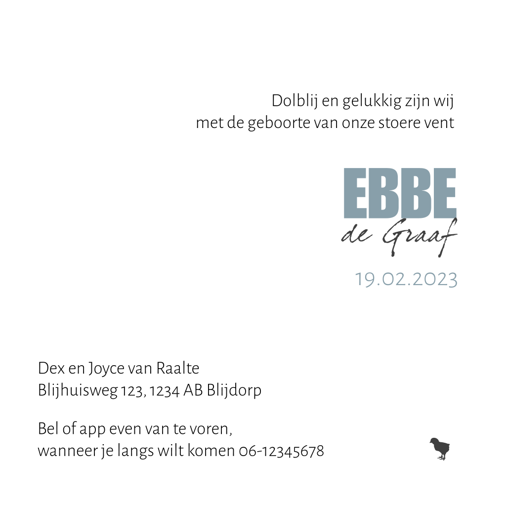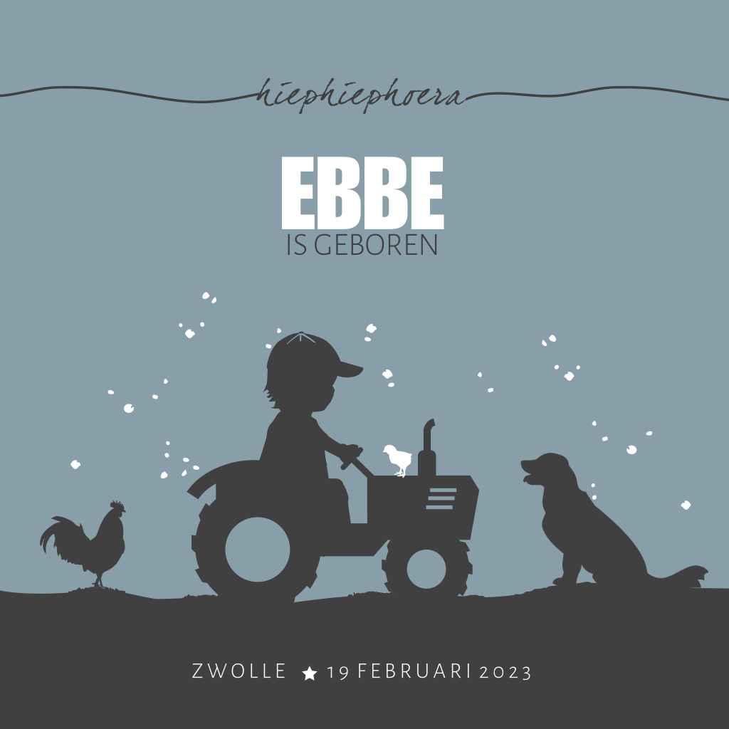 Silhouet geboortekaartje van een jongen rijdend op een tractor. Op dit boerderij stijl baby kaartje zie je verder silhouetten van een kip, kuikentje en een hond.