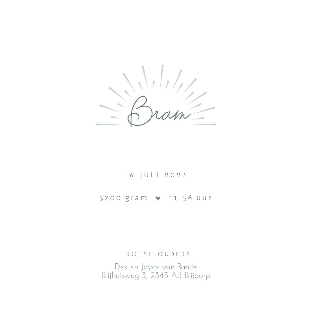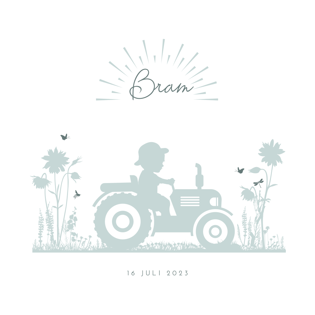 Geboortekaartje voor een zoon met het silhouet van een jongetje rijdend op een tractor tussen de zonnebloemen. De zonnestraaltjes, vlindertjes en bijtjes maken het kaartje vrolijk en zomers. Pas dit kaartje Bram naar je eigen smaak aan in de editor. De teksten, kleuren en lettertypes kun je zelf aanpassen. Ook mogelijk met een ander silhouet of voor een andere gezinssamenstelling.