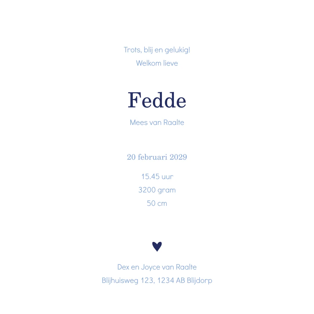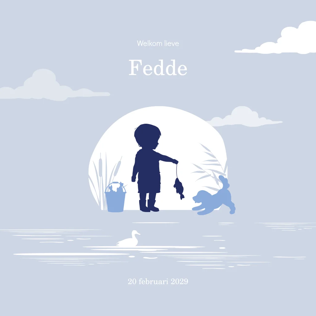 Zijn jullie gek van vissen? Dan past dit jongens geboortekaartje Fedde met een silhouet van een jongen die aan het vissen is mijn zijn hond perfect! Je ziet een water met een jongen met een vis en zijn huisdier. Dit geboortekaartje heeft een mooie zachte blauwe kleur wat perfect past bij het vissen.