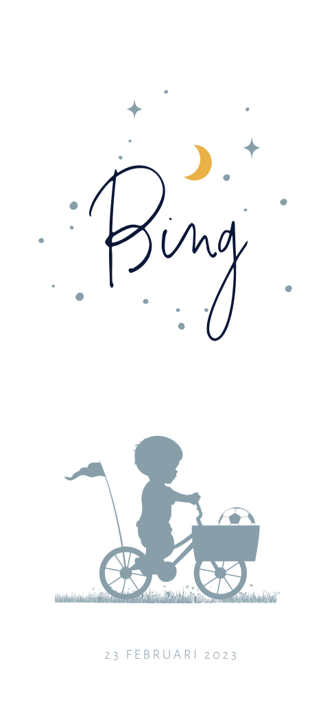 Geboortekaartje voor een jongen met silhouet van jongen op een fiets. Rondom de naam Bing staan sterretjes en een maantje.