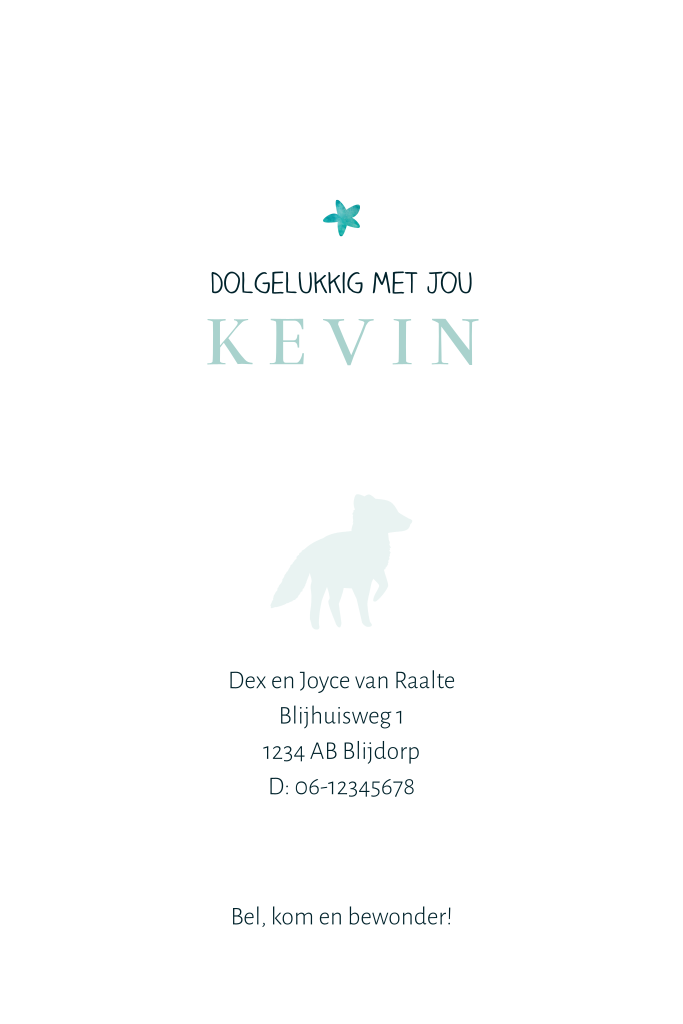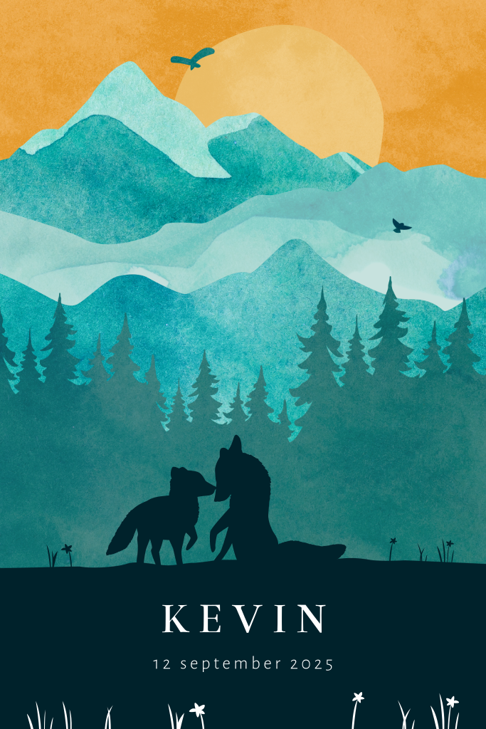 Silhouet geboortekaartje voor een zoon met twee vosjes. Op de achtergrond blauwgroene bergen in aquarel, dennenbomen, vogels en een ondergaande zon. Dit jongenskaartje Kevin is naar je eigen smaak aan te passen in onze editor.