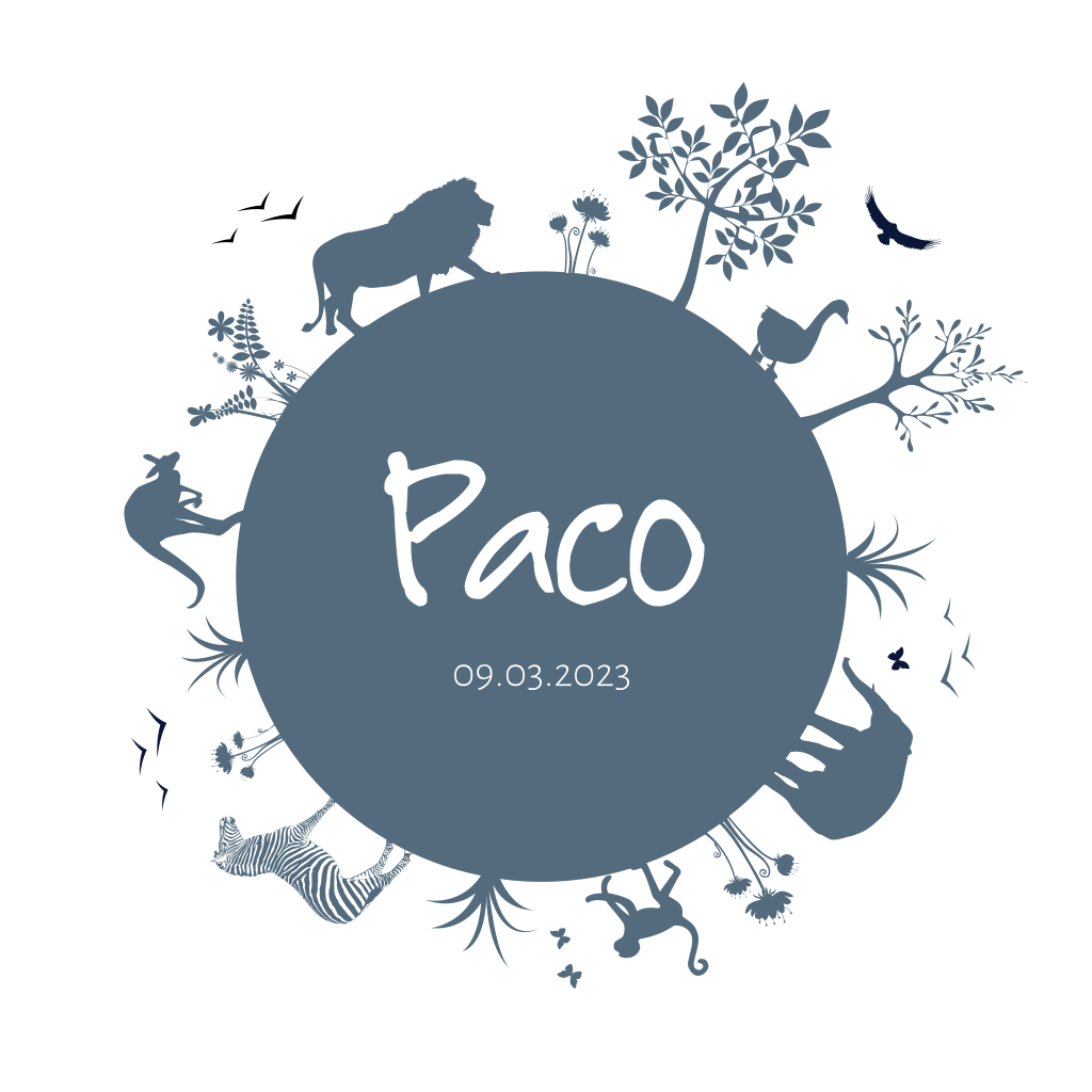Babykaartje voor een jongen met een wereldbol. Op dit kaartje staat de naam van de baby staat centraal in de wereldbol en is omgeven door silhouetten van allerlei dieren., waaronder een olifant, leeuw en een kangoeroe.