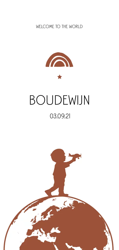 Geboortekaartje voor een zoon in de hippe kleurencombinatie wit met roest bruin. Op dit silhouet kaartje Boudewijn staat een jongen op een wereldbol met een vliegtuigje in zijn hand. Verder op deze kaart een kleine regenboog en sterretje. De kleuren en het silhouet zijn aan te passen.