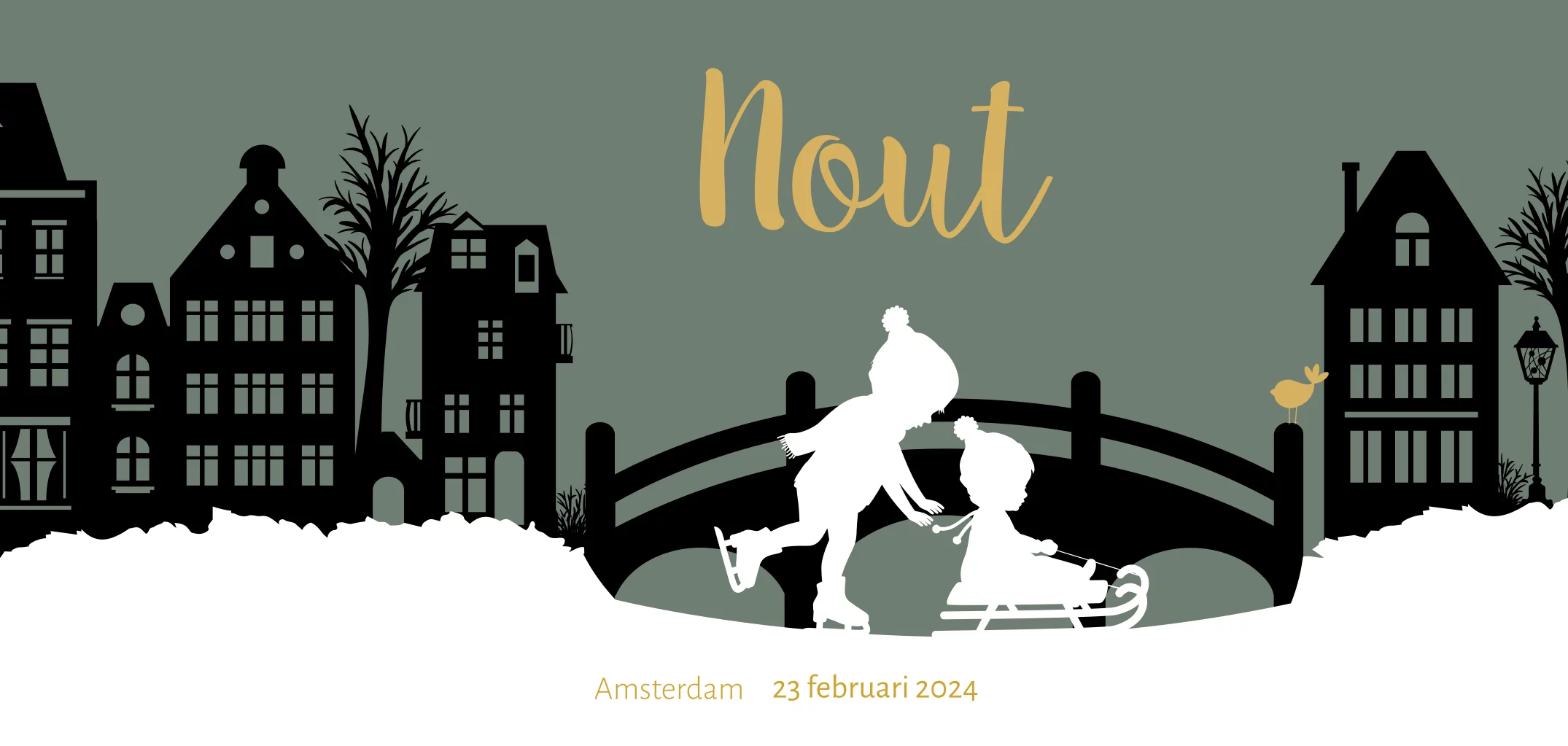Winters silhouet geboortekaartje voor een 2e kindje. Een grote broer op schaatsen duwt zijn kleine baby broertje die op de slee zit.Op de achtergrond huisjes, sneeuw en een brug. De kleuren en silhouetten van dit babykaartje Nout zijn aan te passen.