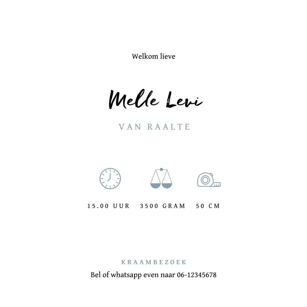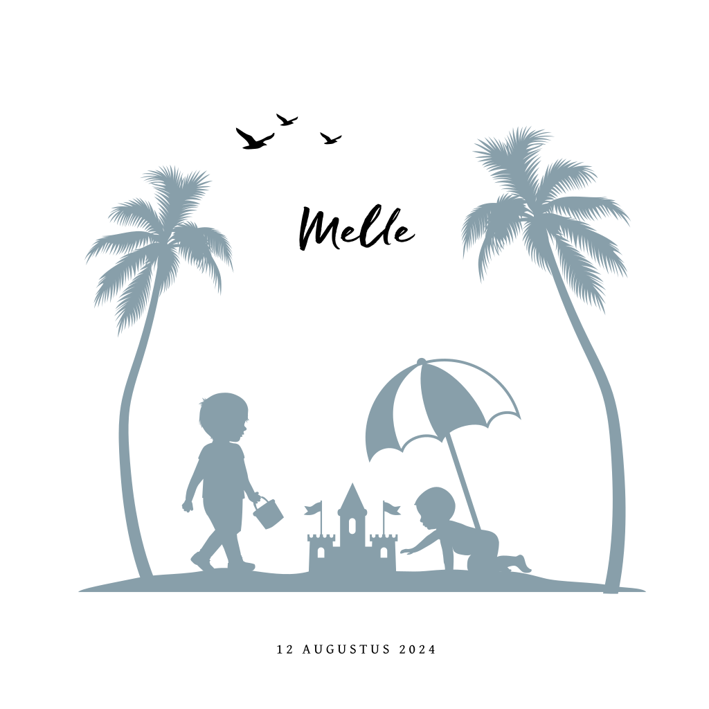 Zomers geboortekaartje met het silhouet van een klein broertje samen met een grote broer die op het strand spelen met een zandkasteel. Verder op dit kaartje tropische palmbomen en een parasol. De kleuren en lettertypes zijn naar je eigen smaak aan te passen. Dit kaartje Melle is voor een tweede kindje, maar ook mogelijk voor een andere gezinssamenstelling of met andere silhouetten.