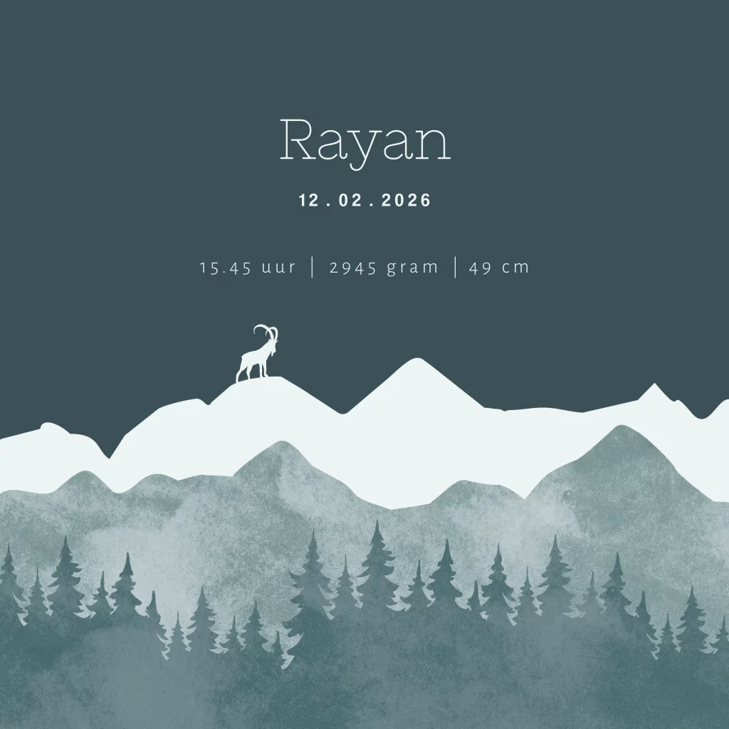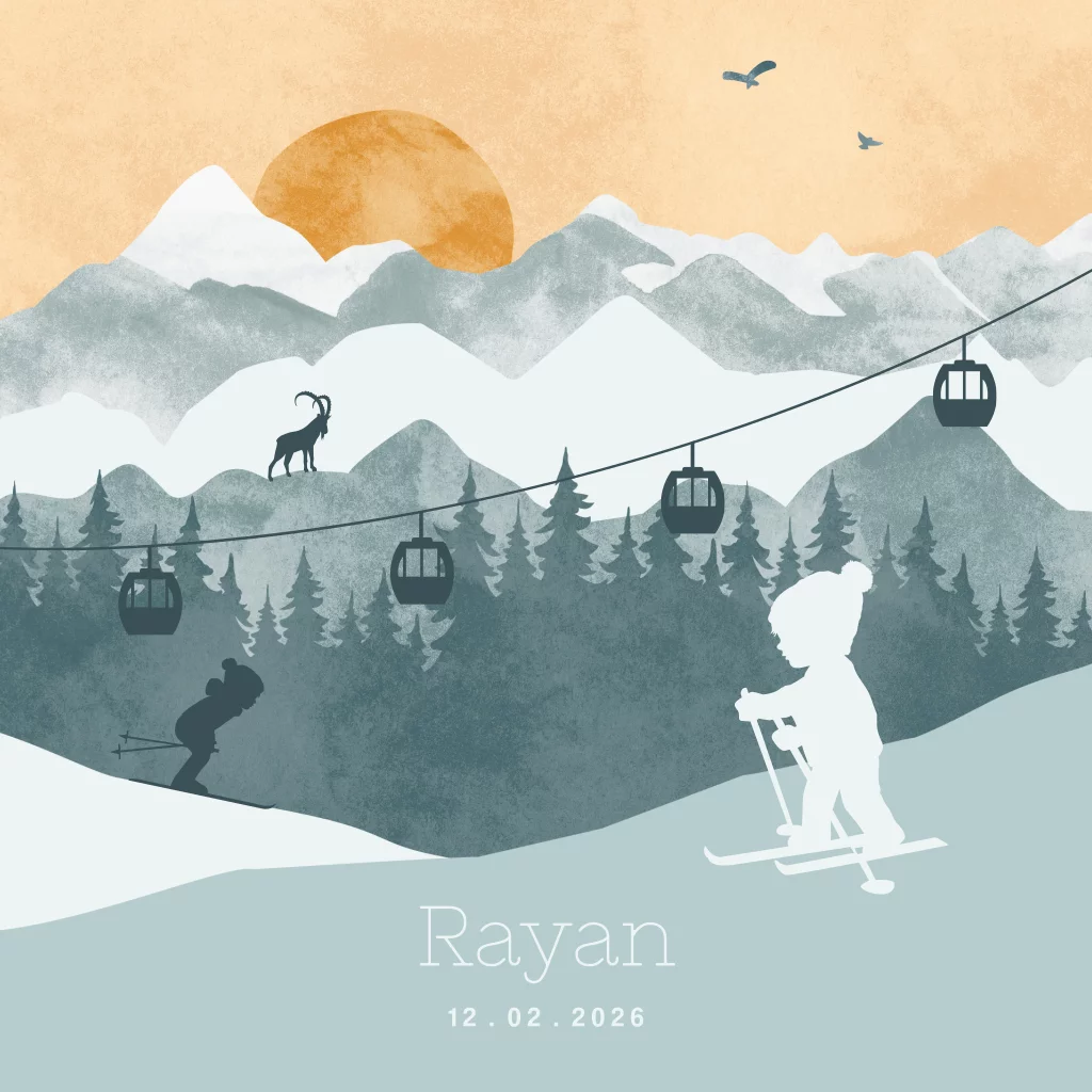 Verwachten jullie in de winter jullie eerste kindje en zijn jullie als ouders gek van skiën? Dan is dit prachtige winterse geboortekaartje helemaal geschikt! Op dit babykaartje Rayan een silhouet van een jongen op een skipiste met op de achtergrond een winters berglandschap met skilift en berggeit. Ook leuk, ontwerp zelf je eigen sluitzegels in onze editor en maak hiermee je geboortekaartje helemaal compleet.