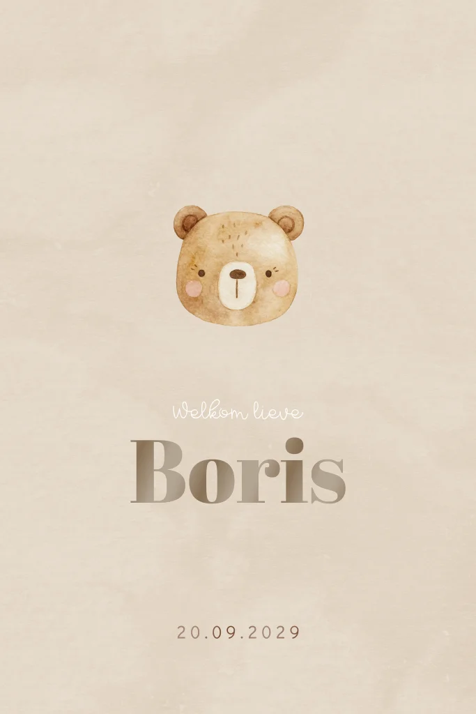 Wanneer je op zoek bent naar een rustig dieren geboortekaartje voor je jongen, is dit ontwerp Boris perfect. Het lieve beertje wordt omlijst door een natuurlijke bruine achtergrond. Het kaartje is voorzien van een luxe UV-spotlak, waardoor de naam van jullie zoon extra opvalt. Pas de kleuren eenvoudig aan in de editor.