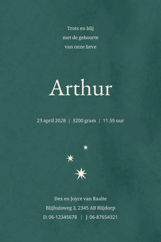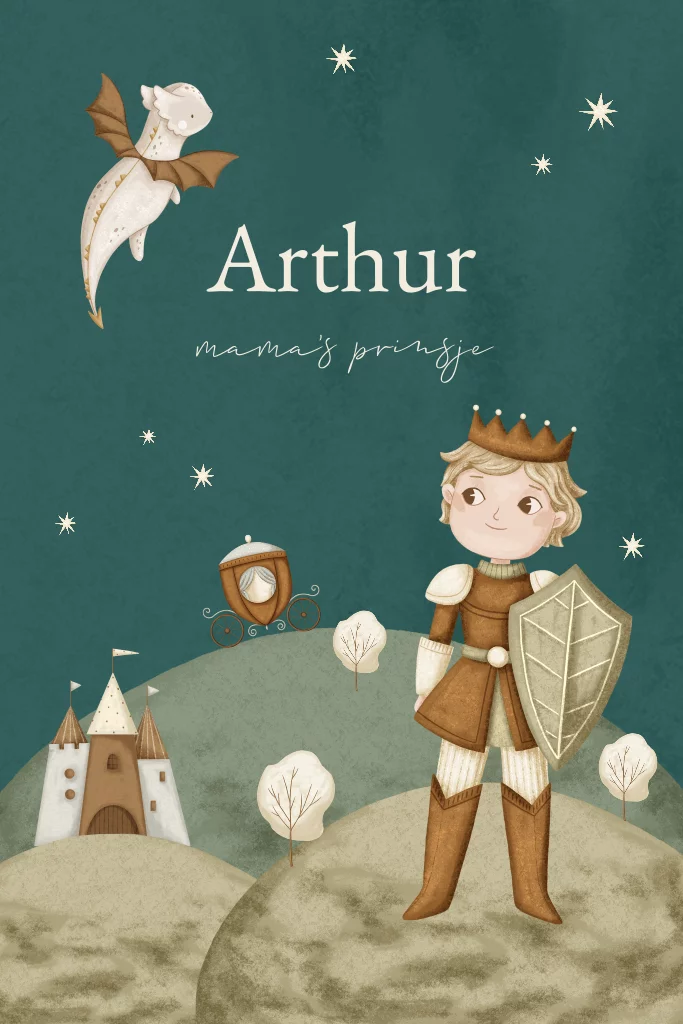 Op dit geboortekaartje Arthur zie je prinsje staan met een kroontje en schild en de toepasselijke tekst 'mama's prinsje'. Op de achtergrond vliegt een draakje tussen de sterren. Verder zie je een kasteel en koets. Dit geboortekaartje vertelt echt een sprookje en past daarom helemaal binnen onze Dreamland trend. Pas dit geboortekaartje geheel naar eigen wens aan in de editor. Ook kun je zelf bepalen of je ronde hoeken wilt.