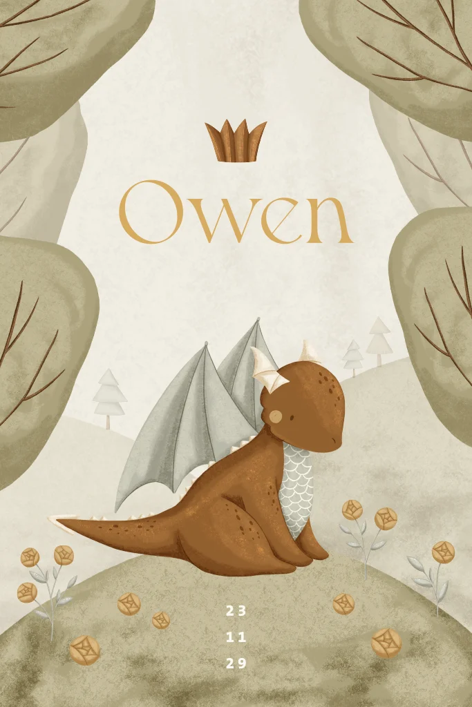 Een prachtig geboortekaartje voor een zoon met een uniek design. Dit geboortekaartje Owen valt onder onze collectie Dreamland en vertelt echt een verhaaltje. Je ziet een lief draakje zitten in een sprookjesbos met heuvels en bloemetjes. De ronde hoeken maken het kaartje helemaal af. Pas de teksten en kleuren eenvoudig aan in de editor.