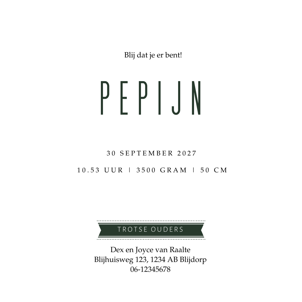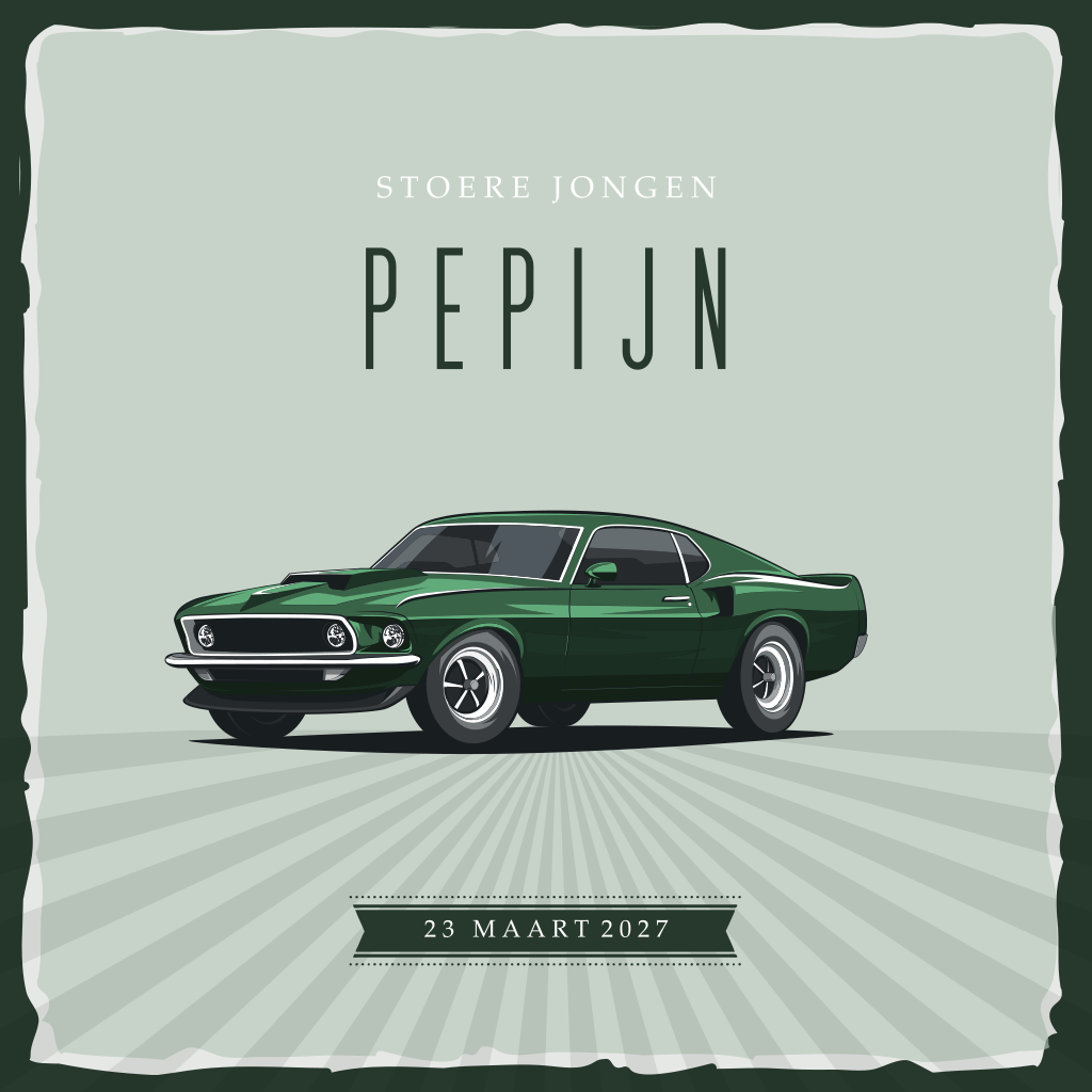 Retro geboortekaartje voor een zoon. Op dit kaartje Pepijn staat een stoere auto en er zijn verschillende groene kleuren gebruikt. Teksten en kleuren zijn aan te passen in de editor.