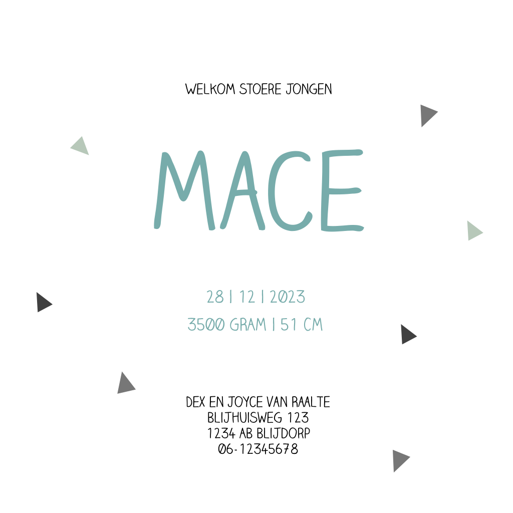 Stoer en geometrisch jongenskaartje met een groot label waarop de babynaam staat. Dit geboortekaartje Mace heeft geometrische vlakken en een stippen patroon. De gebruikte kleurencombinatie is zwart met wit en petrol. De kleine driehoekjes maken het kaartje compleet.