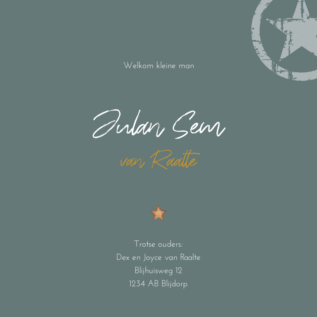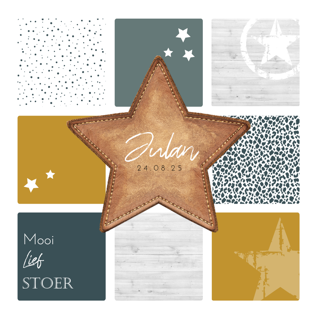 Stoer geboortekaartje voor een jongen met verschillende vlakken. Op dit kaartje Juan is gebruik gemaakt van verschillende kleuren blauw gecombineerd met een bruin label in leder look. De kaart is gedecoreerd met verschillende grote en kleine sterren. De kleuren van dit kaartje zijn aan te passen.