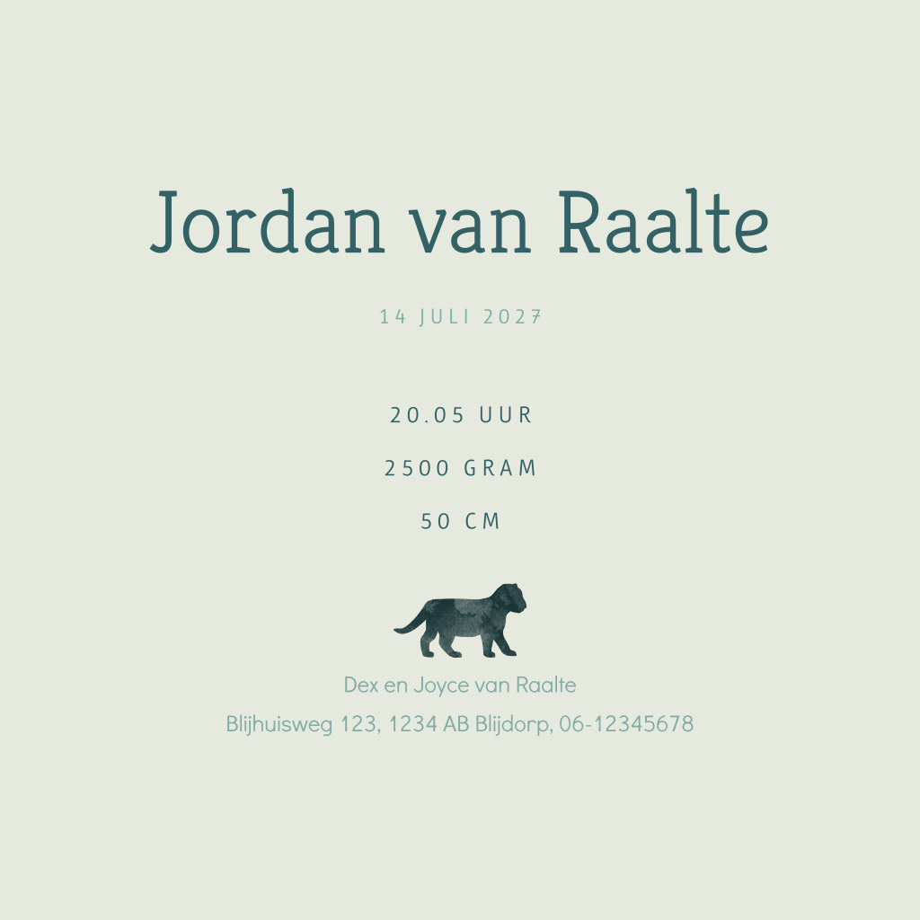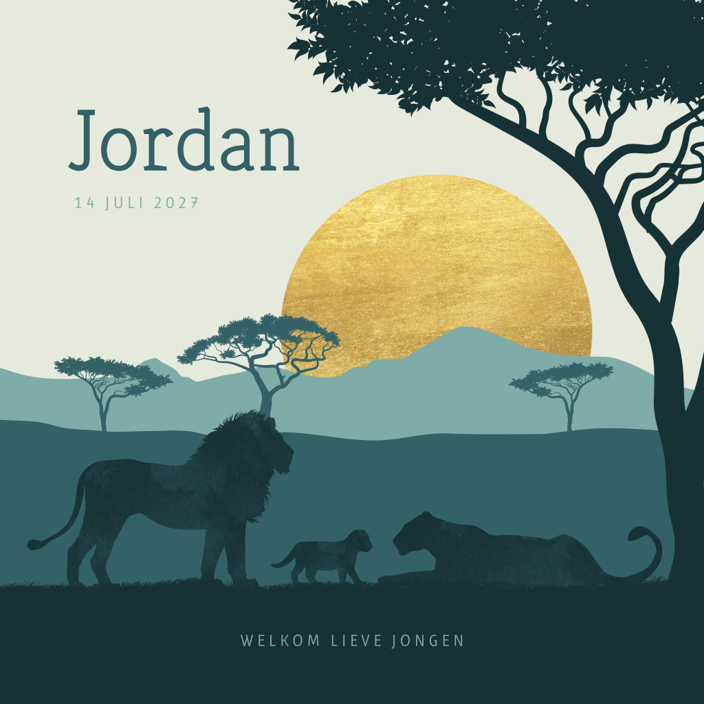 Stoer jongens geboortekaartje met jungle en safari dieren. Op dit geboortekaartje Jordan zie je een blauw ton sur ton safari landschap met bomen en ondergaande zon. Op de voorgrond een vader leeuw met zijn jongen welpje en leeuwin. Pas dit jongenskaartje geheel naar eigen wens aan in de editor. Hulp nodig? Wij helpen je graag!