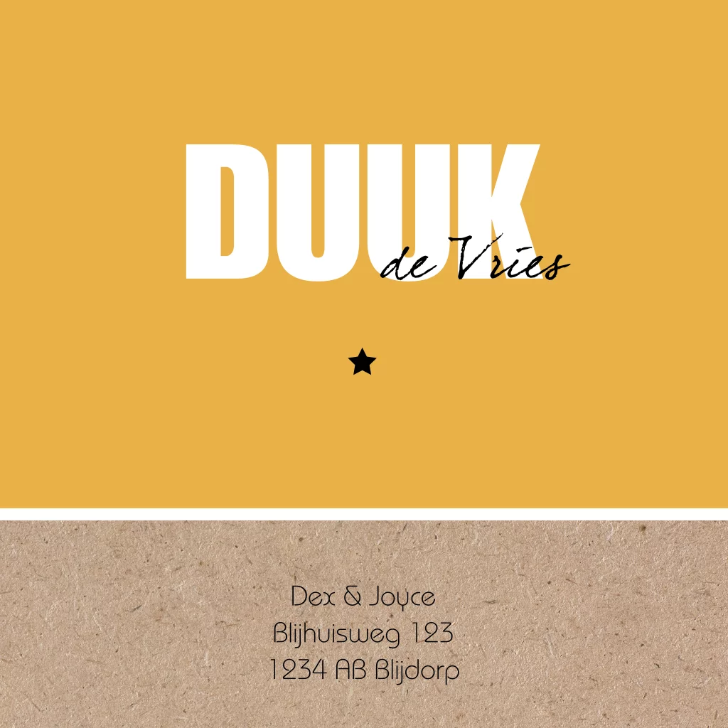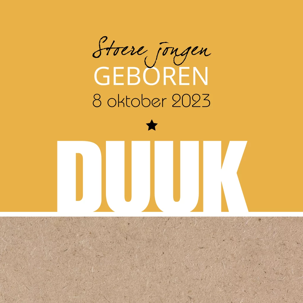 Dit geboortekaartje is voor een jongen. De gele kleur en het karton look geven de kaart een stoere uitstraling. Op de binnenzijde vind je geboortesymbolen die de kaart een typografisch tintje geven.