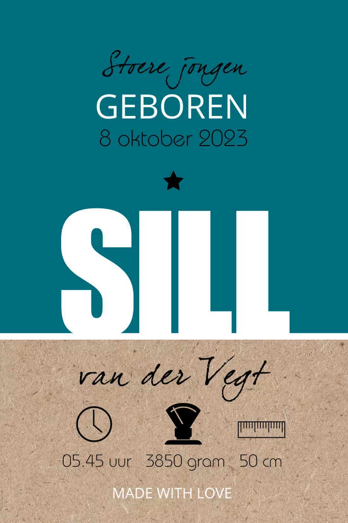 Geboortekaartje voor een jongen. De petrol blauwe kleur en de karton achtergrond geven de kaart een stoere look. De geboorte symbolen staan op de voorkant van de kaart, daardoor ontstaat een typografische look.