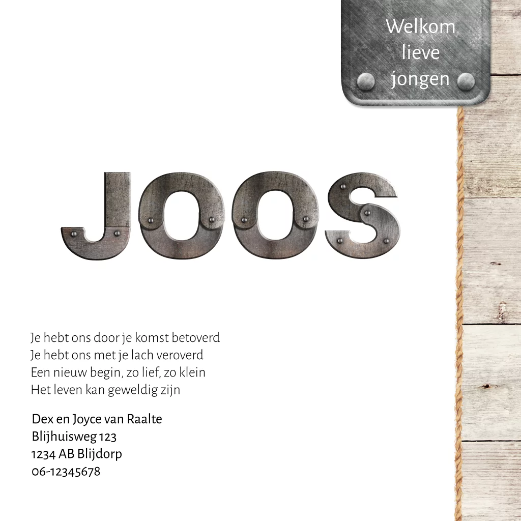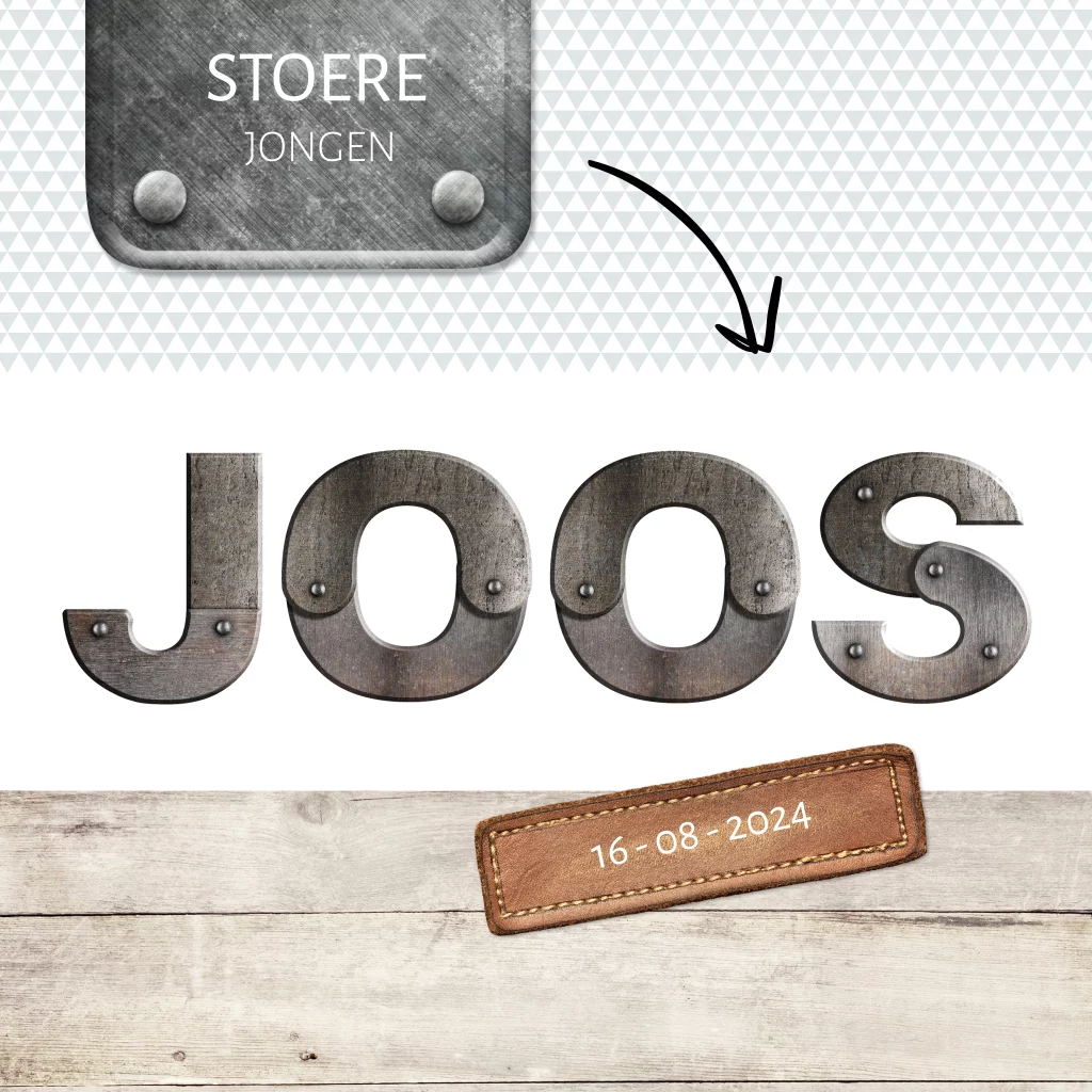 Stoer geboortekaartje voor een jongen met metalen letters. De letters zijn aan te passen in de editor of we helpen je er graag bij. Het metaal op dit jongenskaartje Joos is een mooie combinatie met het gebruikte hout, touw, leren labeltjes en een driehoekjes patroon.
