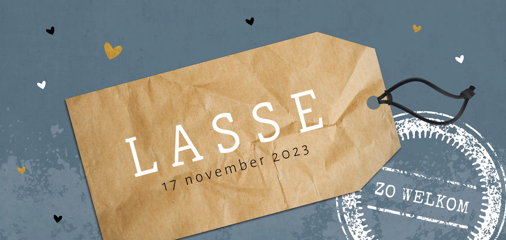 Stoer geboortekaartje voor een zoon. Dit jongenskaartje heeft een grijs blauwe betonlook achtergrond, een stempel met tekst en een afbeelding van een papieren label waarop de babynaam Lasse staat. De kleine hartjes maken dit kaartje af. Teksten en kleuren zijn aan te passen in de editor.