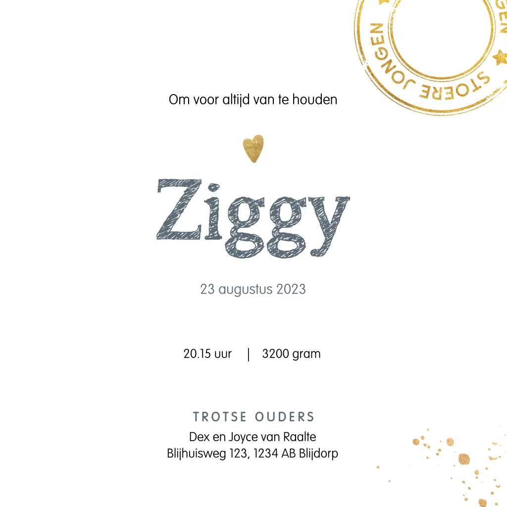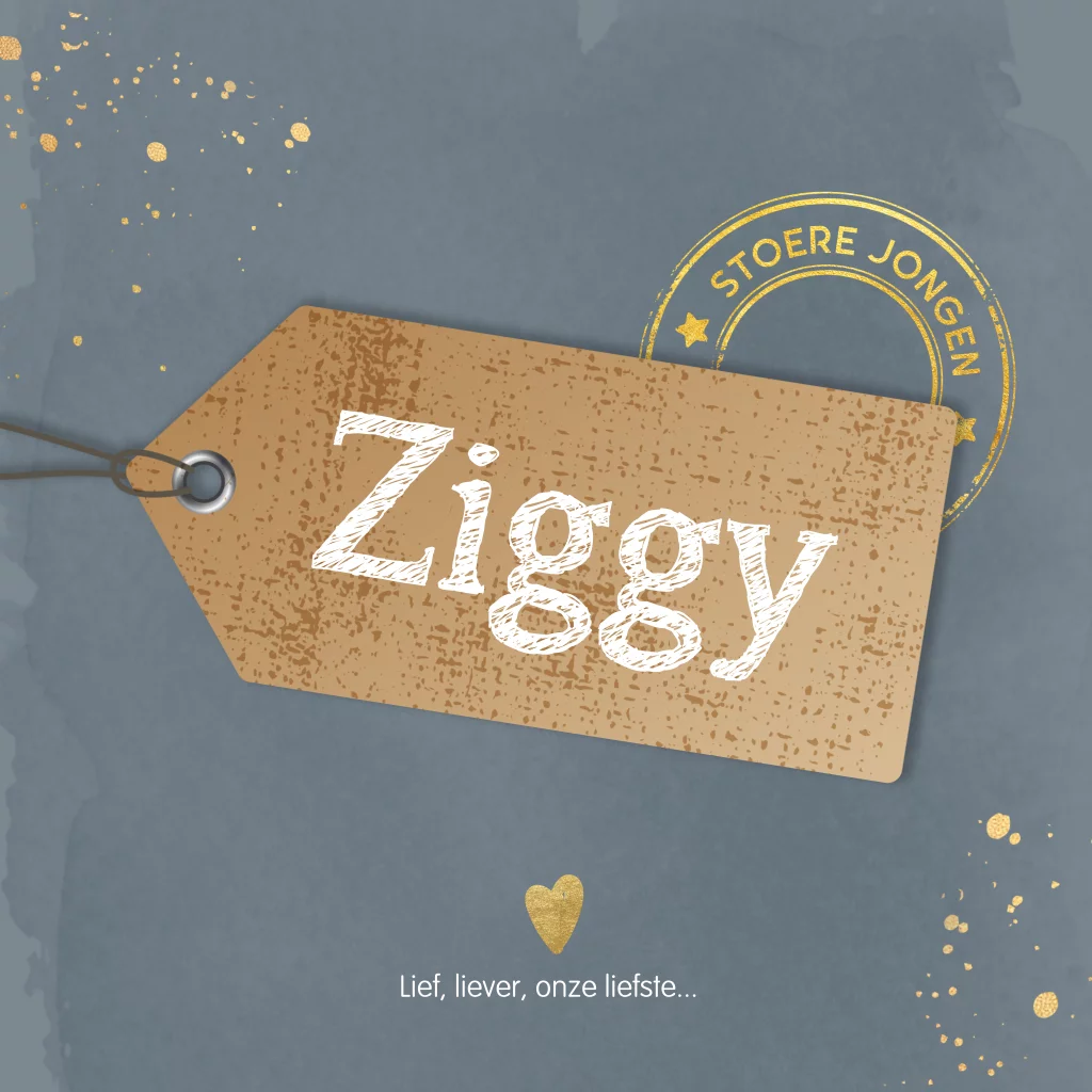 Stoer geboortekaartje voor een jongen. Dit kaartje Ziggy heeft een grijsblauwe aquarel achtergrond met goudkleurige accenten, waaronder een hartje, een stempel en spetters. De babynaam staat op een label. Kleuren en lettertypes zijn aan te passen in de editor.