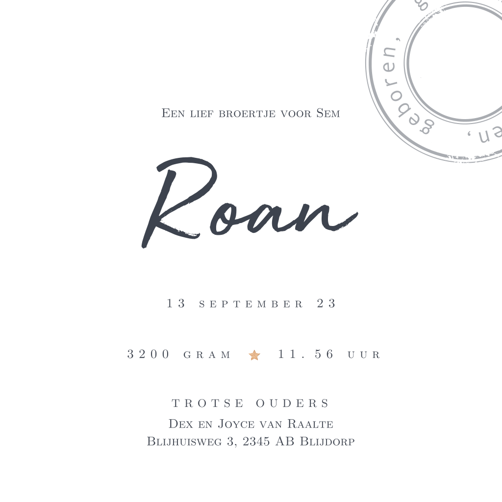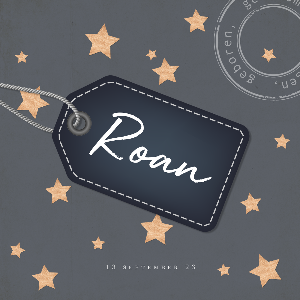 Geboortekaartje voor een jongen met een groot label waarop de naam van de baby staat. Dit kaartje Roan heeft een stoere achtergrond met sterren van hout en een stempel. Kleuren en lettertypes zijn aan te passen in de editor.