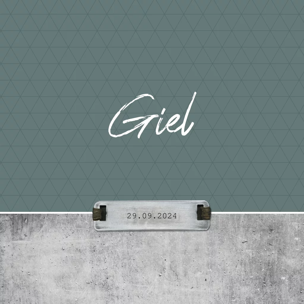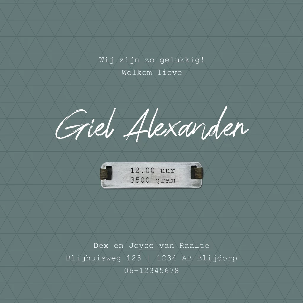 Dit geboortekaartje voor een jongen heeft veel stoere element. Het metalen label en het beton maakt het extra stoer. Op de donkerblauwe achtergrond zitten geometrische lijnen verwerkt.