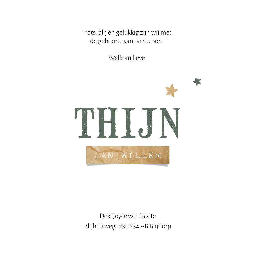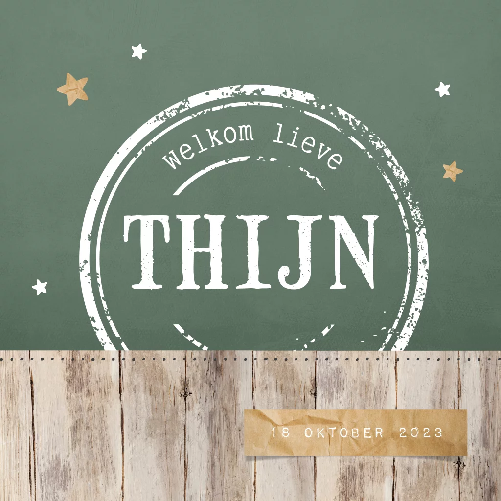 Stoer geboortekaartje voor een zoon. Dit jongenskaartje Thijn heeft een groene achtergrond met een stoere structuur en een grote stempel waarin de babynaam staat. Aan de onderrand hout en een afbeelding van een papieren label met de geboortedatum. De kleine sterretjes maken dit kaartje af. Teksten en kleuren zijn aan te passen in de editor.