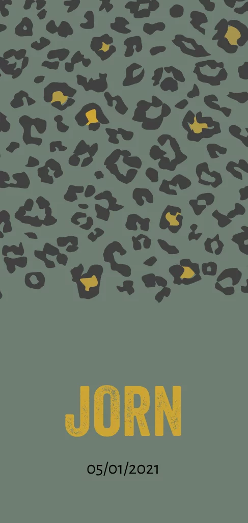 Hip en stoer geboortekaartje voor een jongen met panterprint. De kleurencombinatie legergroen, donkergrijs en okergeel maken de kaart heel stoer. Op de achterkant van de kaart staan geboortesymbolen.