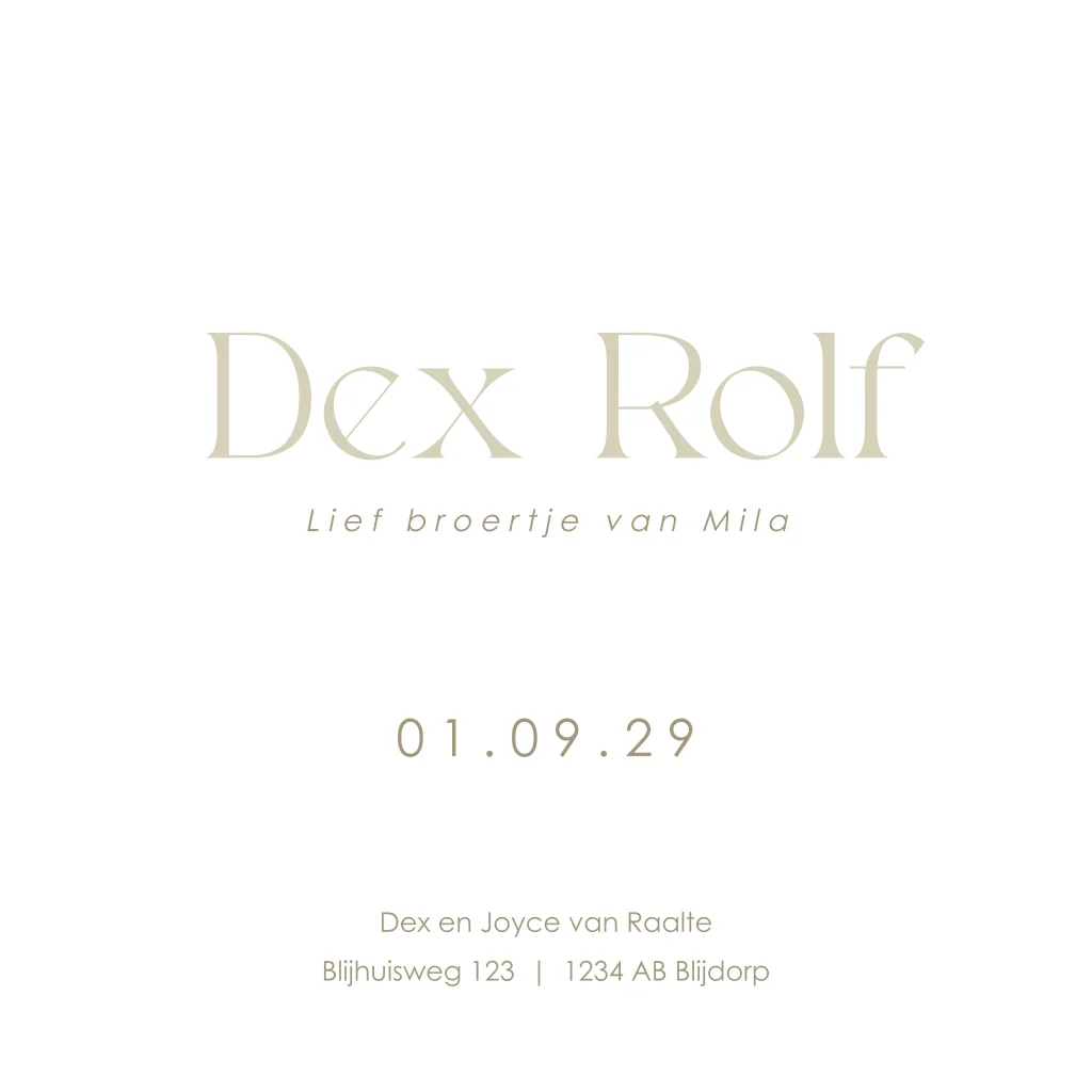 Strak jongens geboortekaartje met de baby naam groot op de voorkant in hoogglans met een zandkleurige achtergrond. Er worden geboortesymbolen gebruikt aan de binnenkant van de kaart. Alle tekst, kleuren en symbolen zijn naar eigen smaak aan te passen in onze editor.