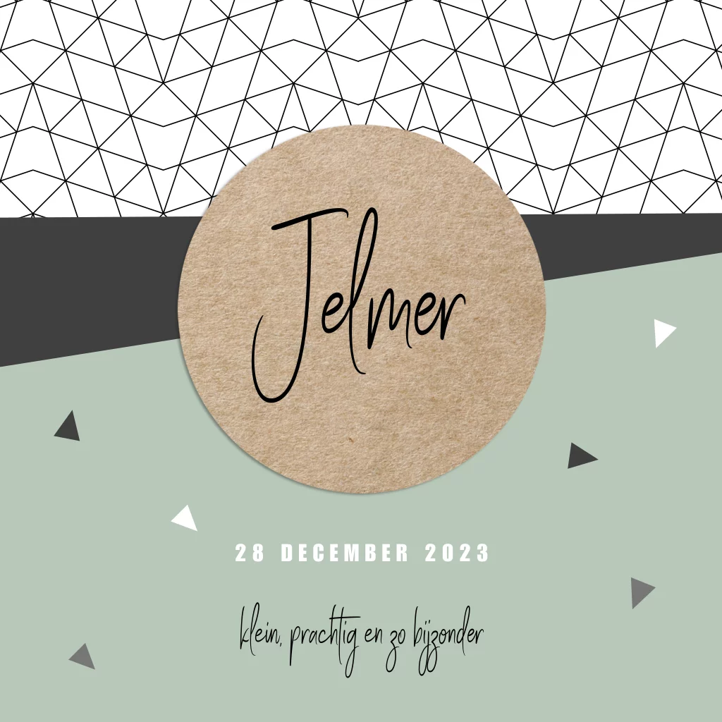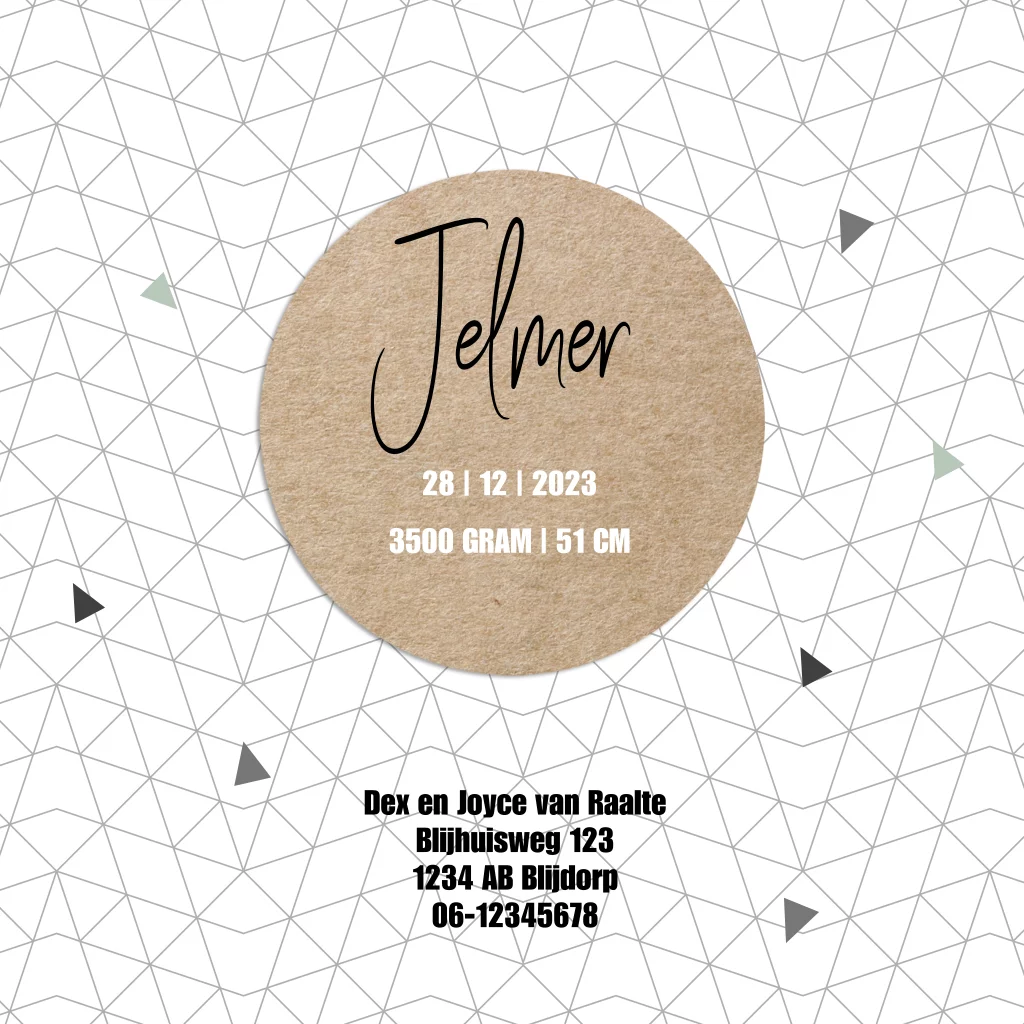 Strak en geometrisch jongenskaartje met een kartonnen cirkel in het midden waar de babynaam op staat. Dit hippe geboortekaartje is door de geometrische lijnen een echte eyecatcher. Deze kartonnen cirkel op de kaart geeft samen met de kleine driehoekjes een speels effect.
