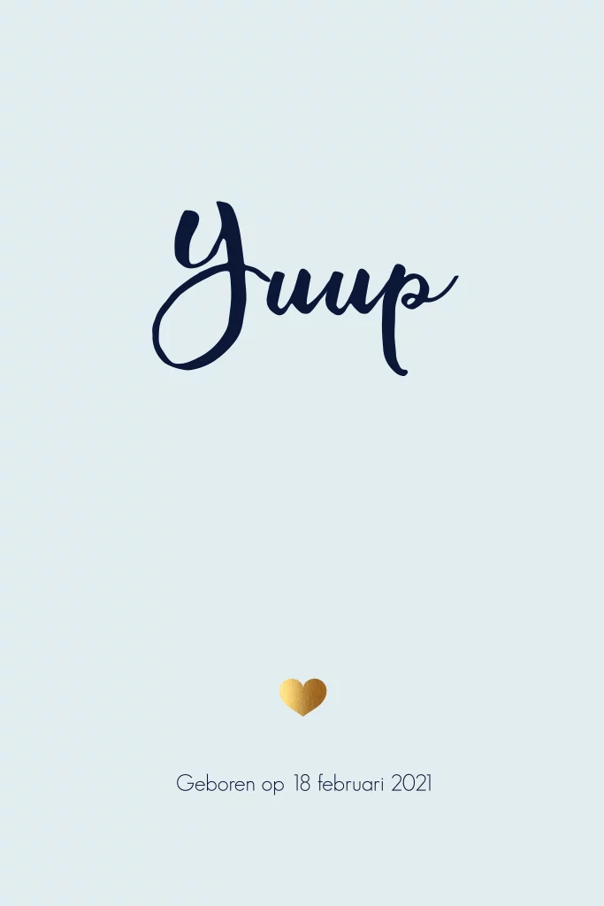 Geboortekaartje voor een jongen met een strak uiterlijk. De kaart is rustig met een effen achtergrond en een klein goudkleurig hartje. Liever een andere kleur? Dit is gemakkelijk aan te passen.