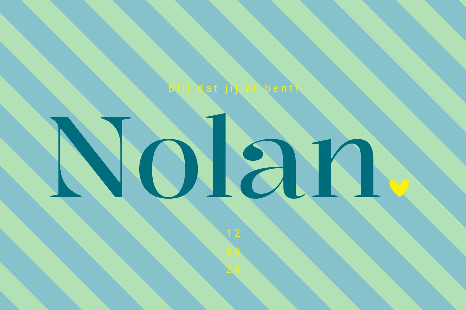 Een stoer geboortekaartje voor een jongen. Op dit kaartje Nolan zie je een opvallende gestreepte achtergrond in blauwe en groene kleurtinten. De gele tekst ´Blij dat je er bent!´, de geboortedatum en het gele hartje zorgen voor een extra opvallende look. Dit kaartje heeft ronde hoeken wat zorgt voor een speels effect. Pas dit geboortekaartje naar eigen wens aan in onze online editor en maak het kaartje af met de petrol envelopkleur.