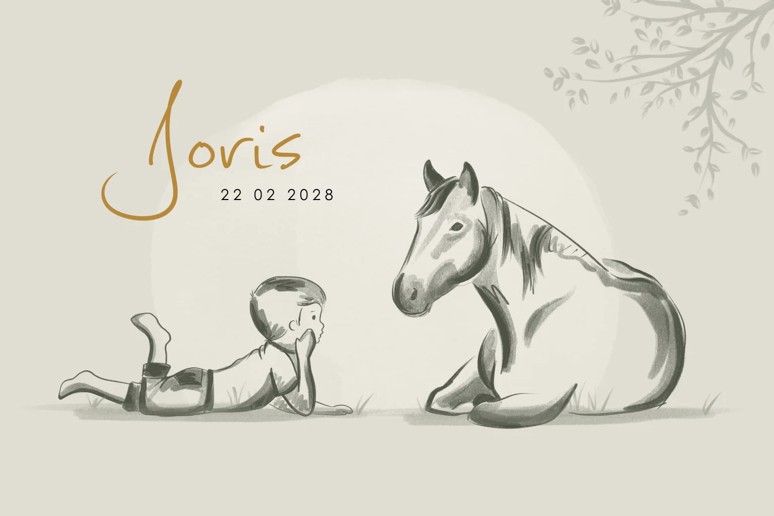 Geboortekaartje voor een jongen met een schets van een jongen en paard, liggend in het gras. Dit geboortekaartje is zeker geschikt voor echte paardenliefhebbers. Pas de kleuren, lettertypes en teksten van dit kaartje Joris gemakkelijk aan in de editor.