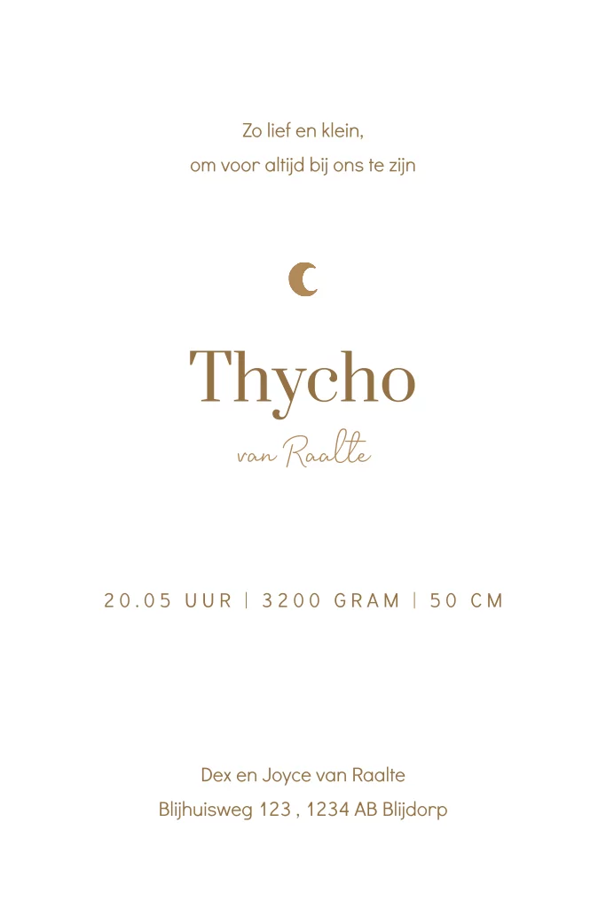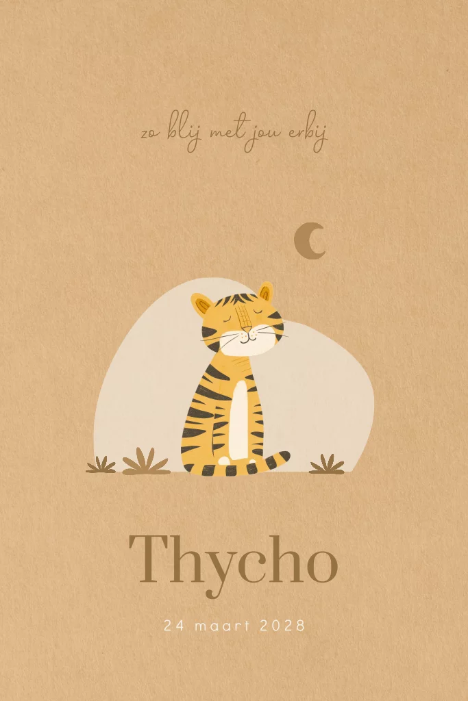Jungle geboortekaartje voor een zoon in zachte aardetinten. Op dit jongenskaartje Thycho zie je een tijger voor een organische vorm met op de achtergrond aan de horizon een maan. Dit jongens kaartje is voorzien van een mooie kraftlook wat een stoere uitstraling geeft. Teksten en kleuren zijn eenvoudig aan te passen in de editor.