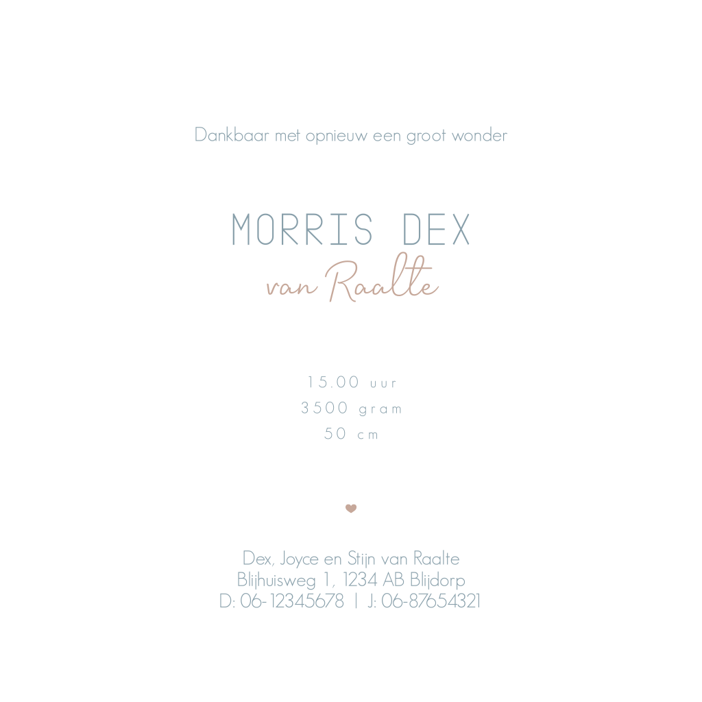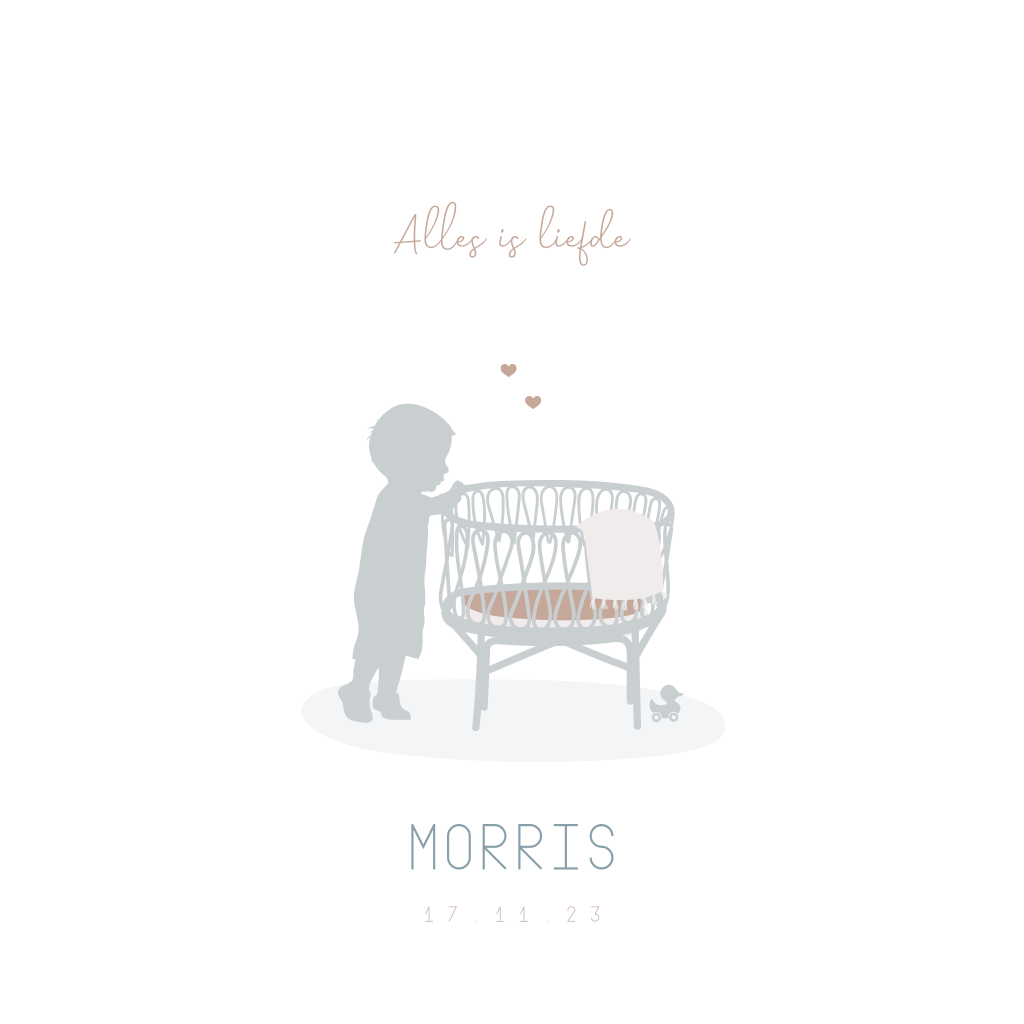 Silhouet geboortekaartje voor een tweede zoon. Vol verwachting staat een grote broer te kijken in het wiegje totdat zijn kleine broertje wordt geboren. Dit jongenskaartje Morris is rustig en clean met zachte natuurlijke kleuren die helemaal van nu zijn. Lettertypes en kleuren zijn aan te passen in de editor. Ook mogelijk voor een andere gezinssamenstelling.