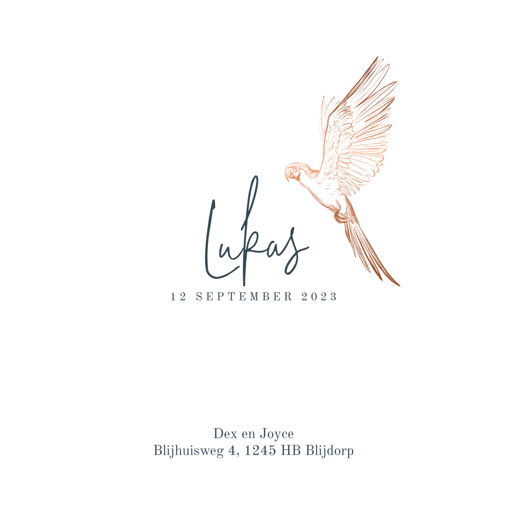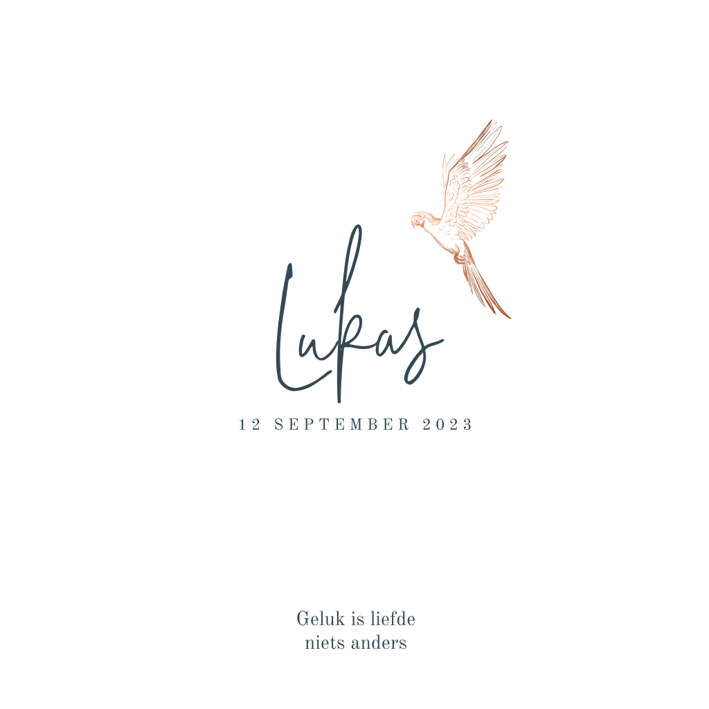 Geboortekaartje voor een jongen met een rustig design. Boven de naam Lukas staat een grote vogel in koperkleur. De teksten en kleuren zijn aan te passen in de editor.