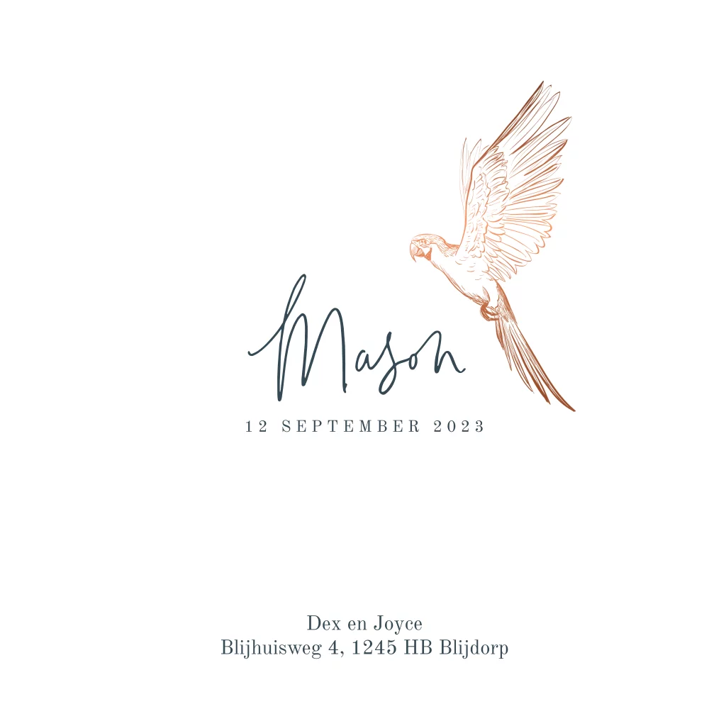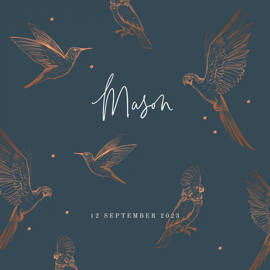 Geboortekaartje voor een jongen met op de achtergrond verschillende vogels in koperkleur. Een mooie combinatie met de donkerblauwe achtergrond en de witte tekst. De babynaam Mason staat in een sierlijk lettertype geschreven. De teksten en kleuren zijn aan te passen in de editor.
