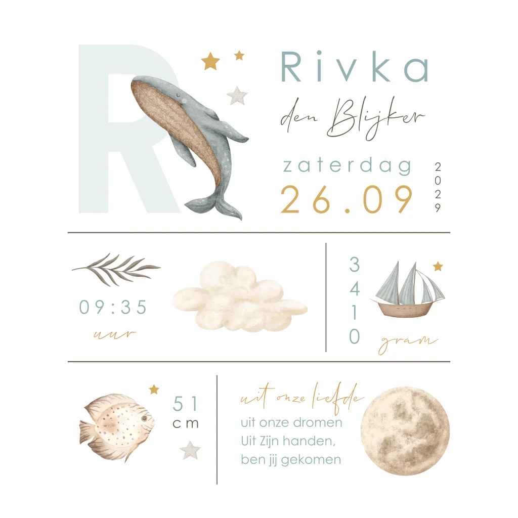 Trendy Christelijk geboortekaartje voor een jongen of meisje. Op dit babykaartje Rivka staat de eerste letter van de babynaam samen met verschillende illustraties van zeedieren waaronder een walvis en vis. In elk vlak zie je iets van de geboortegegevens met een passende illustratie erbij.
