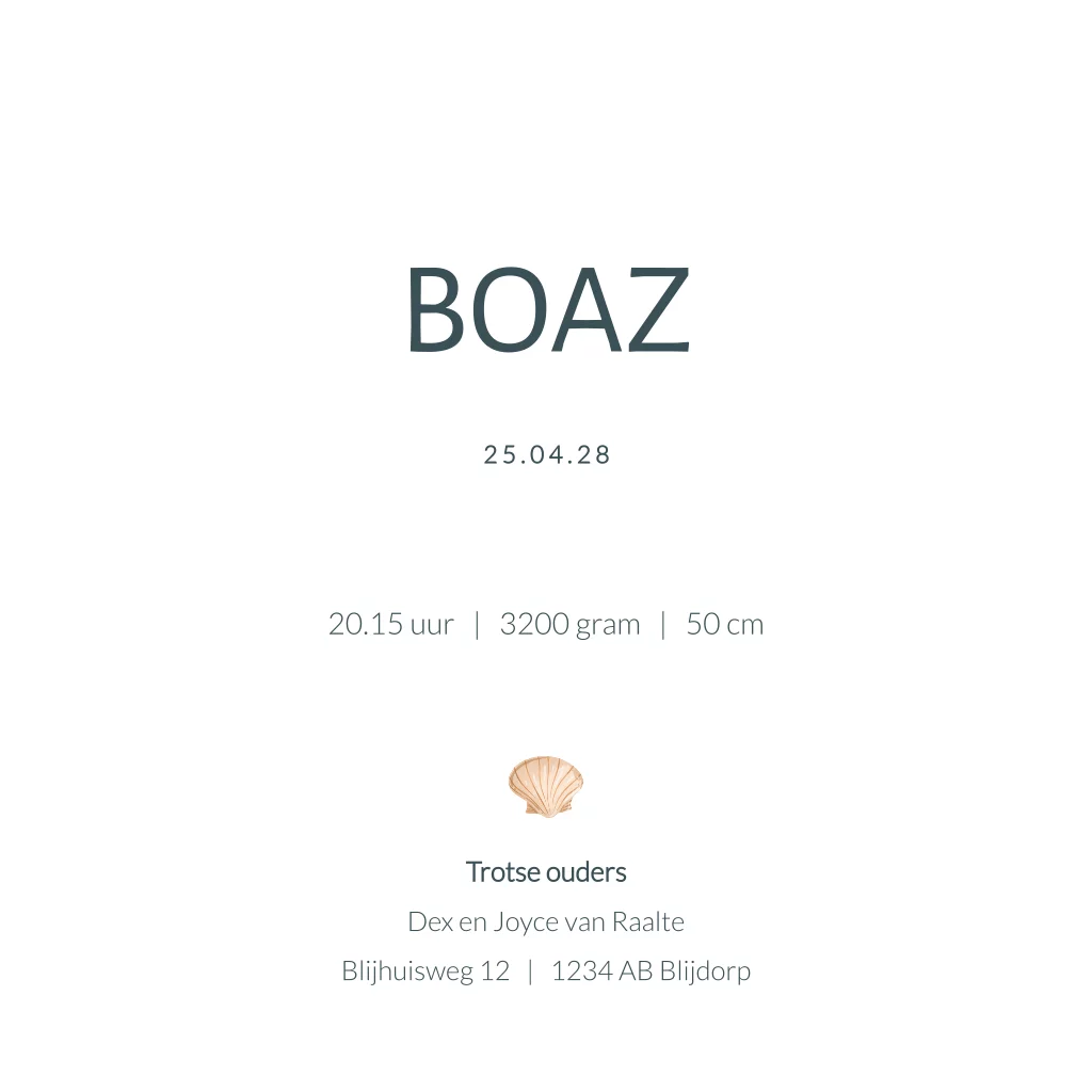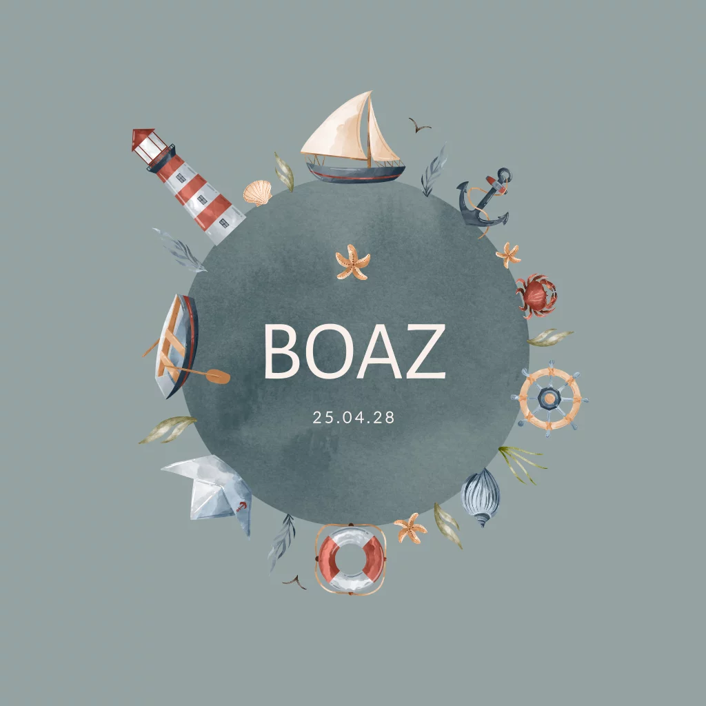 Prachtig geïllustreerd geboortekaartje voor een jongen in zee thema. Je ziet een wereldbol met daaromheen een boot, vuurtoren en andere boot elementen met schelpen. Dit geboortekaartje Boaz is perfect voor ouders die van de zee en varen houden. Pas dit geboortekaartje eenvoudig aan in de editor.