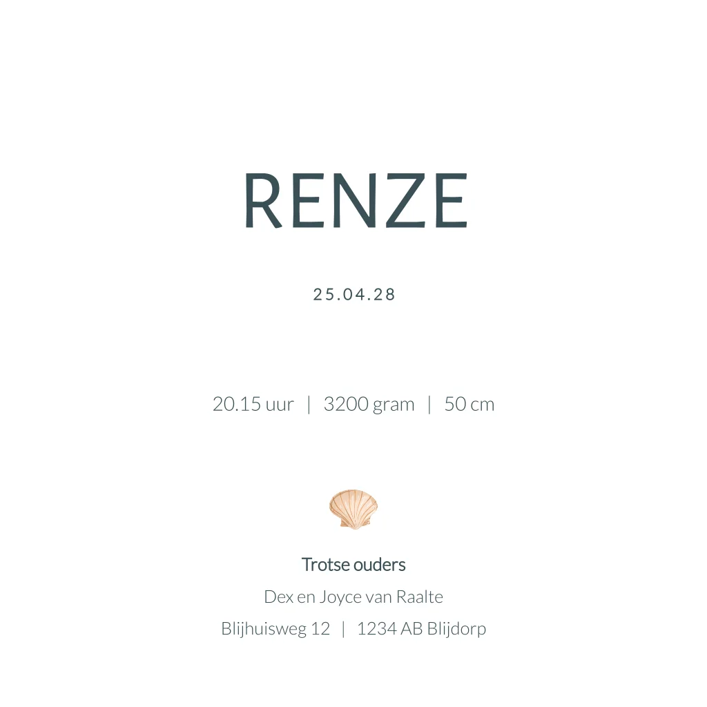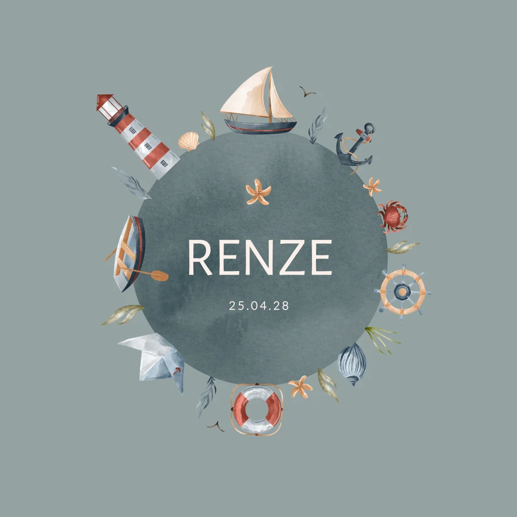 Prachtig geïllustreerd geboortekaartje voor een jongen in Friesland of zee thema. Je ziet een wereldbol met daaromheen een boot, vuurtoren en andere boot elementen met schelpen. Dit Friese geboortekaartje Renze is perfect voor ouders die van Friesland, de zee en varen houden. Pas dit geboortekaartje eenvoudig aan in de editor.