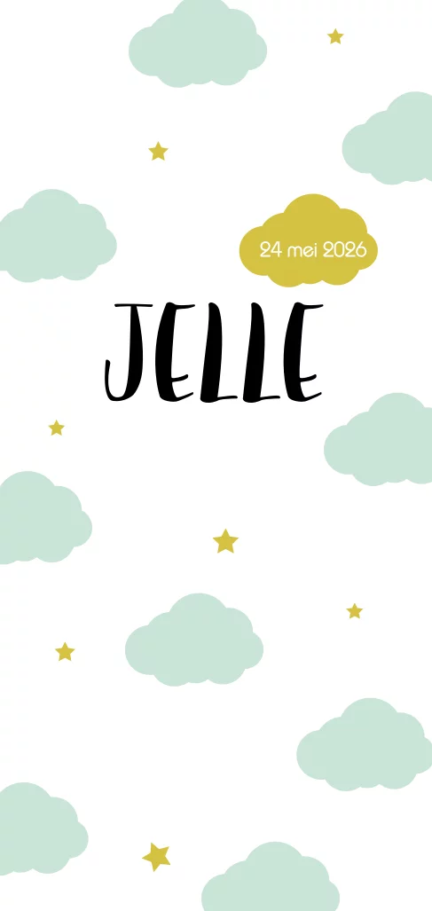Lief geboortekaartje voor een jongen. Op deze kaart staan wolkjes en sterretjes. De zachte kleur pastelgroen is gecombineerd met oker geel, helemaal hip toch?! De kleuren zijn gemakkelijk aan te passen.