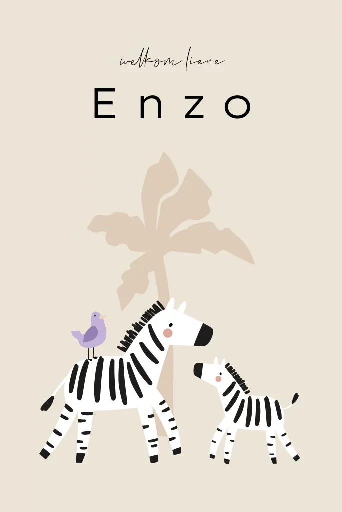 Geboortekaartje voor een jongen met zebra's. Één zebra heeft een vogeltje op zijn rug. De achtergrond van dit geboortekaartje Enzo heeft een beige tint en het vogeltje heeft een lila kleur.