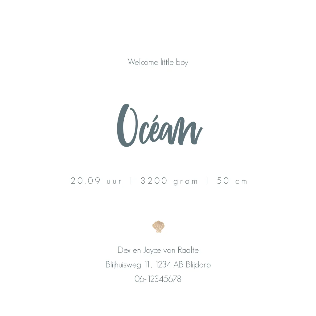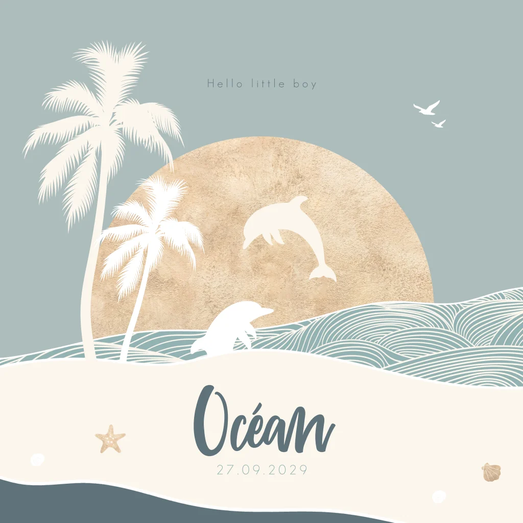 Hip silhouet geboortekaartje voor een zoon. Op dit jongenskaartje Océan staan 2 duikende dolfijnen, palmbomen en een ondergaande zon. Schelpen en zeesterren maken het babykaartje helemaal af. Liever andere kleuren of lettertypes? Pas het eenvoudig aan in onze editor.