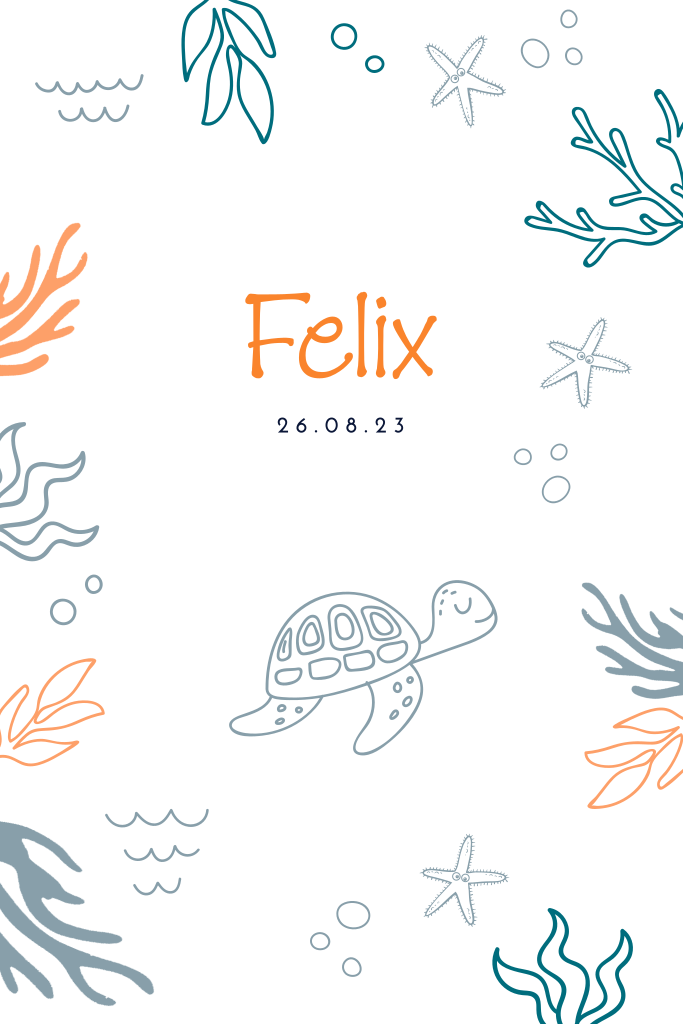 Geboortekaartje voor een jongen met elementen uit de onderwaterwereld, waaronder een schildpad en zeesterren. Dit kaartje Felix heeft een rustige en lieve uitstraling. Teksten en kleuren zijn aan te passen in de editor.