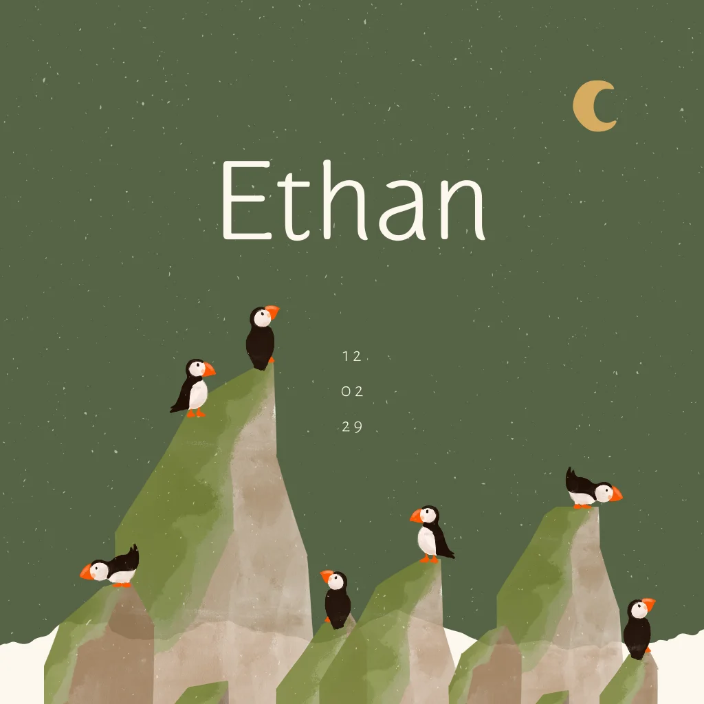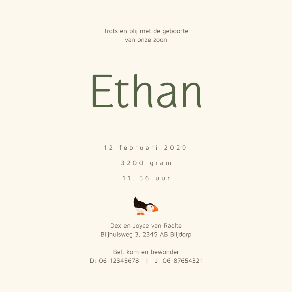 Dit prachtige geboortekaartje Ethan is perfect voor ouders die op zoek zijn naar een avontuurlijke en stoere aankondiging van de geboorte van hun zoon. De illustratieve afbeelding van papegaaiduikers op een klif straalt avontuur en vrijheid uit. Pas dit geboortekaartje voor een jongen eenvoudig aan in de editor. Hulp nodig? Wij helpen je graag!