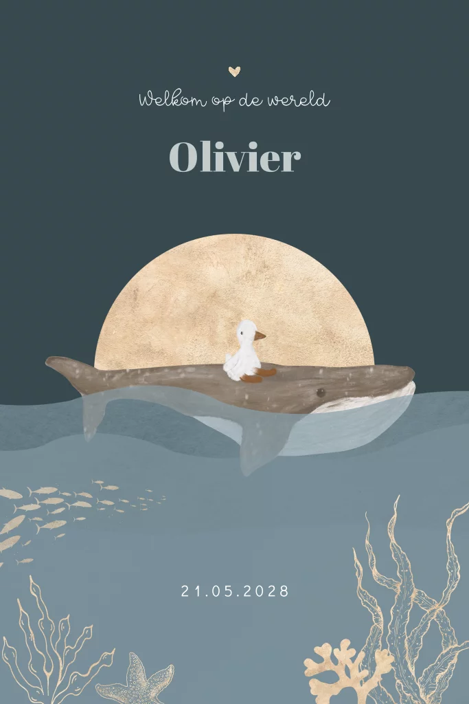 Geboortekaartje voor een jongen. Op dit geboortekaartje Olivier zie je een walvis met eend zwemmen in de zee. Achter de zee gaat de zon onder. Het kaartje heeft afgeronde hoeken wat een speels effect geeft. Dit geboortekaartje met zee thema is perfect voor ouders die van de zee en van zee- en waterdieren houden. Pas dit geboortekaartje naar je eigen wens aan in de editor en combineer met een mooie envelop en sluitzegel om het helemaal af te maken.
