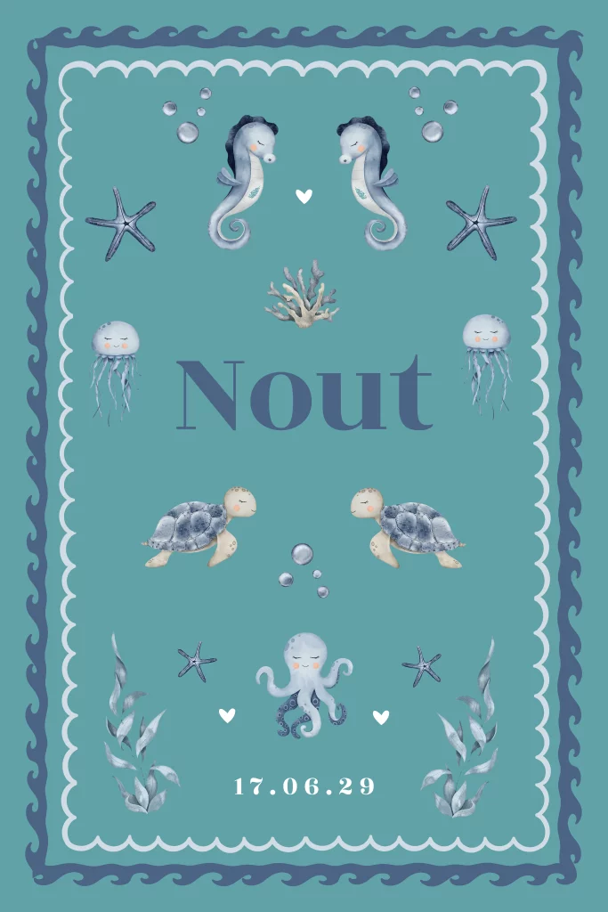 Een tof geboortekaartje voor een jongen met allerlei zeedieren! Op dit geboortekaartje Nout zie je schattige geïllustreerde zeepaardjes, schildpadden, kwallen en een octopus. Dit geboortekaartje voor jullie zoon heeft afgeronde hoeken en golvende kaders. Pas dit geboortekaartje met blauwe kleurtinten naar eigen wens aan in onze online editor. Vragen of wensen? Laat het gerust weten, wij helpen je graag.
