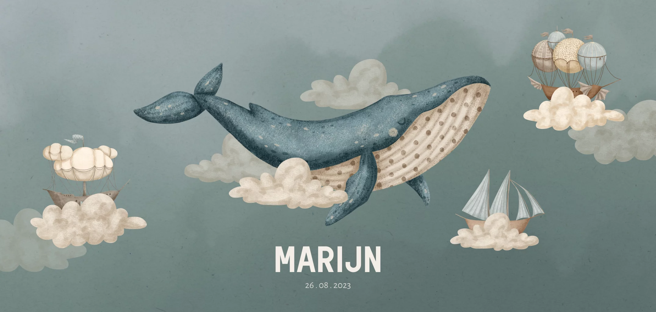 Geboortekaartje walvis zwevend tussen wolken en schepen