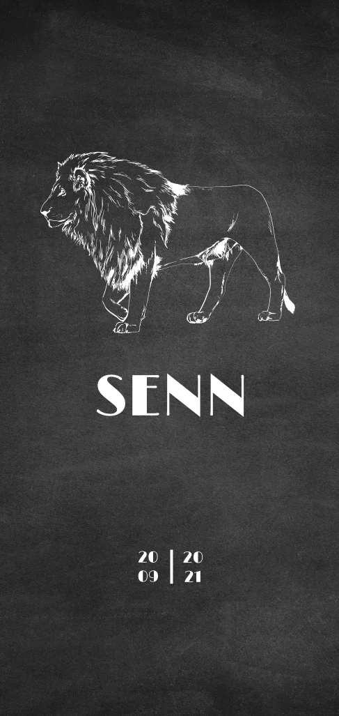 Dit jongens geboortekaartje met leeuw heeft een stoere uitstraling door het krijtbord op de achtergrond. Het zwart wit maakt het rustig en basic. De zwarte kleur op de voorkant van de kaart is eenvoudig aan te passen en zo ontstaat er direct een andere stijl