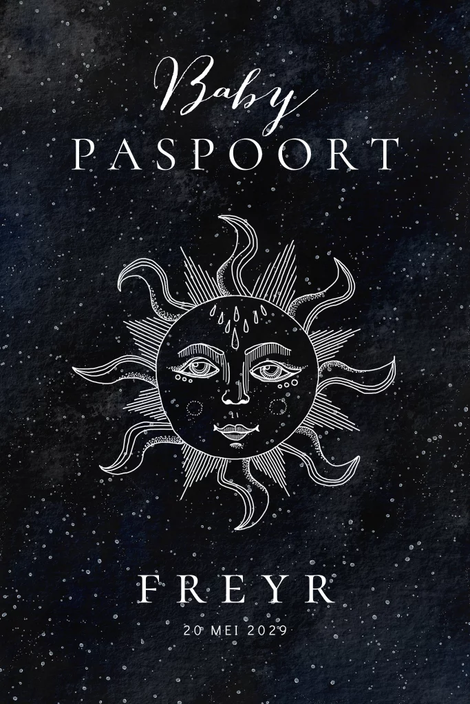 Een spiritueel paspoort geboortekaartje voor een jongen. Dit geboortekaartje Freyr heeft een spirituele look door de zwarte achtergrond met witte lijntekening van een zon in het universum. In de binnenzijde kun je een eigen foto toevoegen van jullie kindje. Pas dit paspoort geboortekaartje voor jullie zoon naar eigen wens aan in onze online editor.